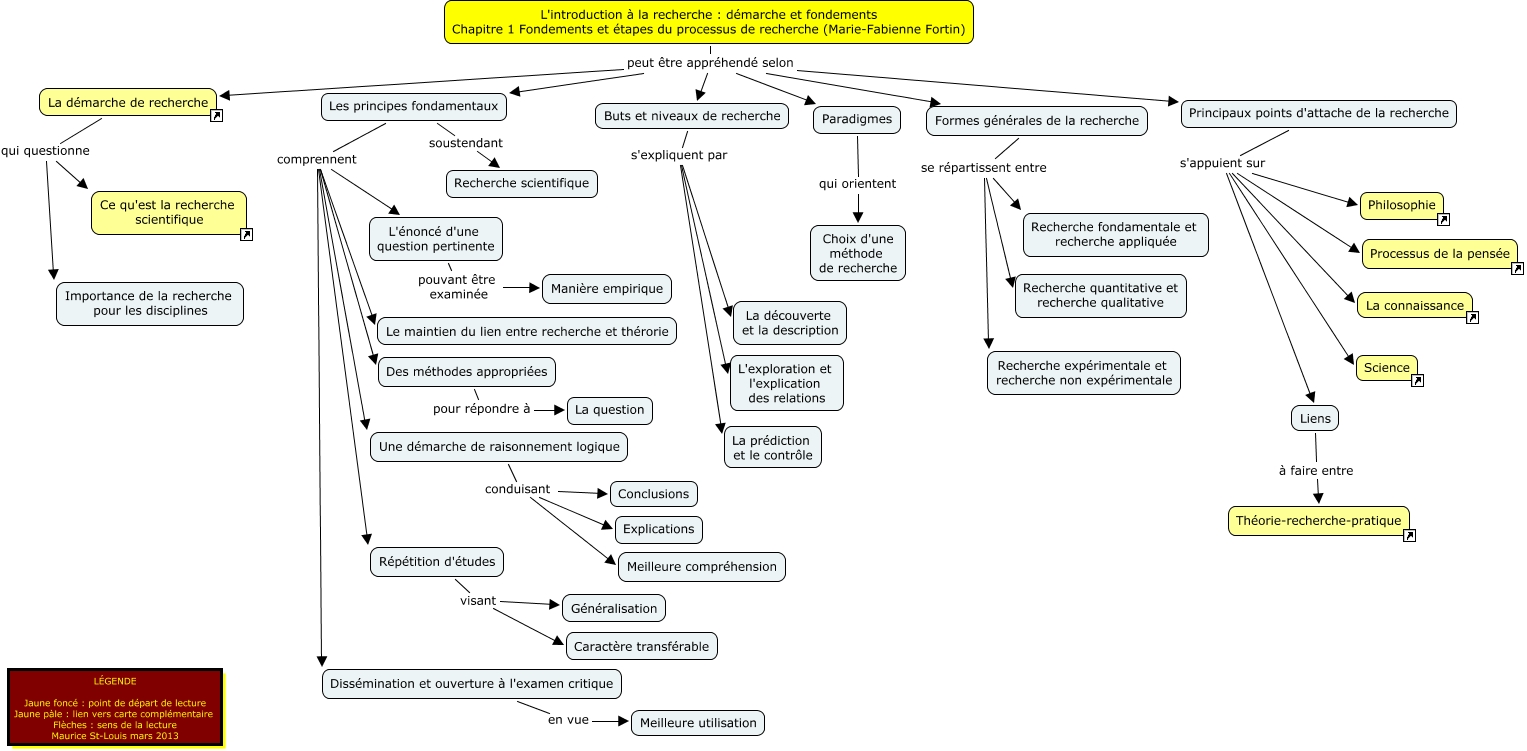 Cette carte de concepts créée avec IHMC CmapTools traite de: 1-L'introduction à la recherche_ démarche et fondements, Des méthodes appropriées pour répondre à La question, Les principes fondamentaux comprennent Une démarche de raisonnement logique, L'introduction à la recherche : démarche et fondements Chapitre 1 Fondements et étapes du processus de recherche (Marie-Fabienne Fortin) peut être appréhendé selon Les principes fondamentaux, Les principes fondamentaux comprennent Des méthodes appropriées, Buts et niveaux de recherche s'expliquent par La prédiction et le contrôle, Liens à faire entre Théorie-recherche-pratique, L'introduction à la recherche : démarche et fondements Chapitre 1 Fondements et étapes du processus de recherche (Marie-Fabienne Fortin) peut être appréhendé selon La démarche de recherche, Dissémination et ouverture à l'examen critique en vue Meilleure utilisation, Une démarche de raisonnement logique conduisant Meilleure compréhension, Principaux points d'attache de la recherche s'appuient sur La connaissance, La démarche de recherche qui questionne Importance de la recherche pour les disciplines, Une démarche de raisonnement logique conduisant Explications, L'introduction à la recherche : démarche et fondements Chapitre 1 Fondements et étapes du processus de recherche (Marie-Fabienne Fortin) peut être appréhendé selon Paradigmes, Principaux points d'attache de la recherche s'appuient sur Processus de la pensée, Les principes fondamentaux comprennent L'énoncé d'une question pertinente, Formes générales de la recherche se répartissent entre Recherche quantitative et recherche qualitative, Paradigmes qui orientent Choix d'une méthode de recherche, Répétition d'études visant Généralisation, Les principes fondamentaux comprennent Le maintien du lien entre recherche et thérorie, Buts et niveaux de recherche s'expliquent par La découverte et la description