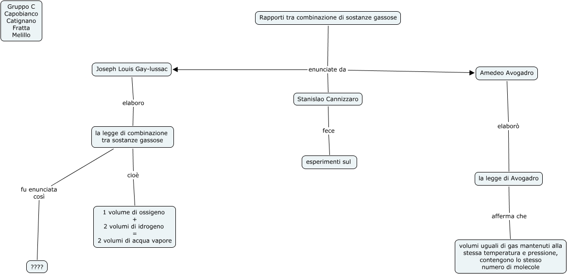 Questa Cmap, creata con IHMC CmapTools, contiene informazioni relative a: GC Avogadro La Mole 52 - 58, Joseph Louis Gay-lussac elaboro la legge di combinazione tra sostanze gassose, la legge di combinazione tra sostanze gassose cioè 1 volume di ossigeno + 2 volumi di idrogeno = 2 volumi di acqua vapore, Amedeo Avogadro elaborò la legge di Avogadro, la legge di Avogadro afferma che volumi uguali di gas mantenuti alla stessa temperatura e pressione, contengono lo stesso numero di molecole, Rapporti tra combinazione di sostanze gassose enunciate da Joseph Louis Gay-lussac, Rapporti tra combinazione di sostanze gassose enunciate da Stanislao Cannizzaro, Rapporti tra combinazione di sostanze gassose enunciate da Amedeo Avogadro, la legge di combinazione tra sostanze gassose fu enunciata così ????, Stanislao Cannizzaro fece esperimenti sul