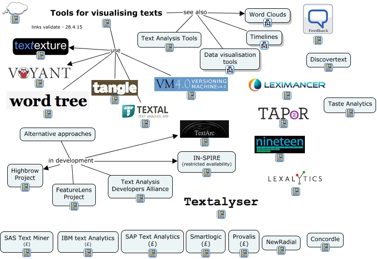This Concept Map, created with IHMC CmapTools, has information related to: Text visualisation tools, Alternative approaches in development FeatureLens Project, Tools for visualising texts see also Data visualisation tools, Alternative approaches in development IN-SPIRE (restricted availability), Tools for visualising texts see also Timelines, Alternative approaches in development, Tools for visualising texts see also Text Analysis Tools, Tools for visualising texts use, Alternative approaches in development Text Analysis Developers Alliance, Tools for visualising texts use, Alternative approaches in development Highbrow Project, Tools for visualising texts use, Tools for visualising texts use, Tools for visualising texts use, Tools for visualising texts use, Tools for visualising texts see also Word Clouds