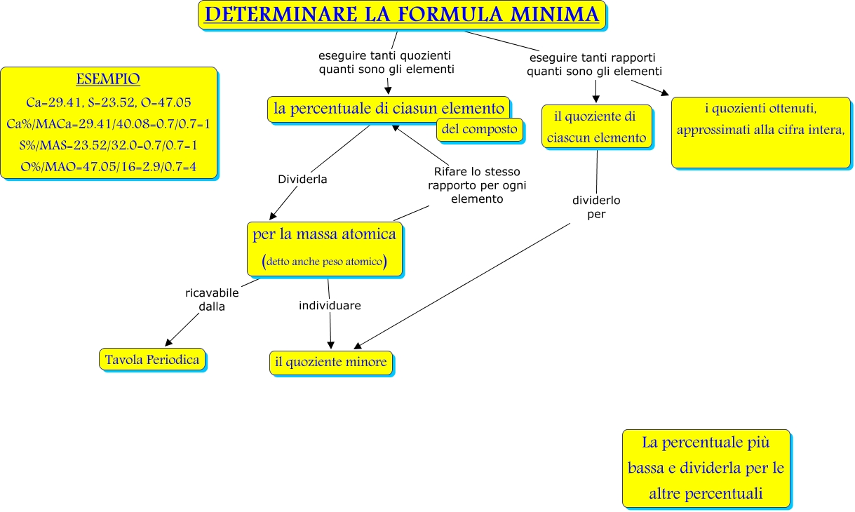 Questa Cmap, creata con IHMC CmapTools, contiene informazioni relative a: Formula minima, DETERMINARE LA FORMULA MINIMA eseguire tanti rapporti quanti sono gli elementi il quoziente di ciascun elemento, per la massa atomica (detto anche peso atomico) ricavabile dalla Tavola Periodica, per la massa atomica (detto anche peso atomico) Rifare lo stesso rapporto per ogni elemento la percentuale di ciasun elemento, DETERMINARE LA FORMULA MINIMA eseguire tanti rapporti quanti sono gli elementi i quozienti ottenuti, approssimati alla cifra intera,, il quoziente di ciascun elemento dividerlo per il quoziente minore, per la massa atomica (detto anche peso atomico) individuare il quoziente minore, la percentuale di ciasun elemento Dividerla per la massa atomica (detto anche peso atomico), DETERMINARE LA FORMULA MINIMA eseguire tanti quozienti quanti sono gli elementi la percentuale di ciasun elemento