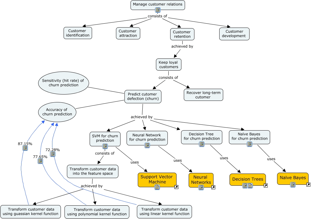 This Concept Map, created with IHMC CmapTools, has information related to: Classification_Techniques_in_Marketing, Transform customer data into the feature space achieved by Transform customer data using linear kernel function, Transform customer data into the feature space achieved by Transform customer data using polynomial kernel function, Manage customer relations consists of Customer identification, Keep loyal customers consists of Predict cutomer defection (churn), SVM for churn prediction 87.15% Accuracy of churn prediction, Predict cutomer defection (churn) achieved by SVM for churn prediction, Decision Tree for churn prediction 62% Accuracy of churn prediction, Neural Network for churn prediction uses Neural Networks, Transform customer data using guassian kernel function 87.15% Accuracy of churn prediction, Manage customer relations consists of Customer retention, Predict cutomer defection (churn) Sensitivity (hit rate) of churn prediction, Neural Network for churn prediction 78.12% Accuracy of churn prediction, Predict cutomer defection (churn) achieved by Naïve Bayes for churn prediction, Transform customer data using polynomial kernel function 77.65% Accuracy of churn prediction, Customer retention achieved by Keep loyal customers, Naïve Bayes for churn prediction 83.24% Accuracy of churn prediction, Transform customer data using linear kernel function 72.28% Accuracy of churn prediction, Manage customer relations consists of Customer development, Manage customer relations consists of Customer attraction, Transform customer data into the feature space achieved by Transform customer data using guassian kernel function