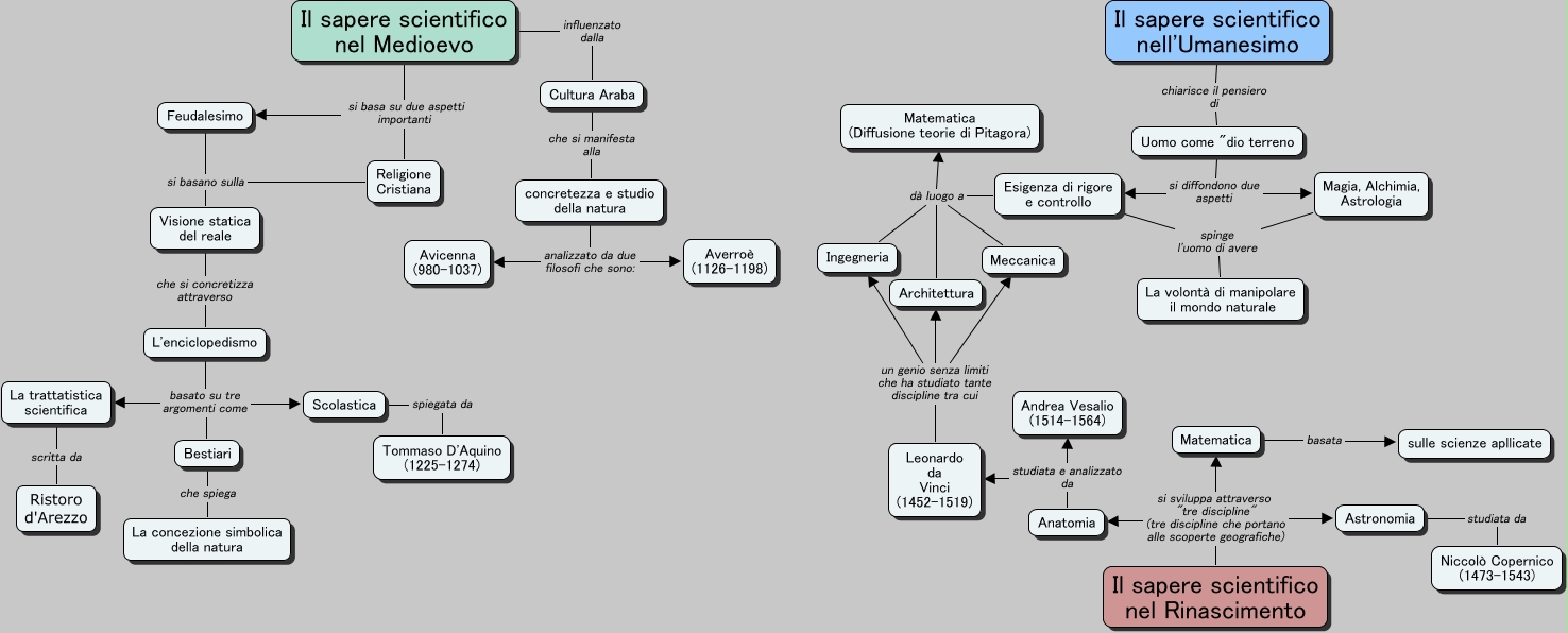 Questa Cmap, creata con IHMC CmapTools, contiene informazioni relative a: Mescuso_Saperi scientifici, Esigenza di rigore e controllo dà luogo a Meccanica, Matematica basata sulle scienze apllicate, concretezza e studio della natura analizzato da due filosofi che sono: Avicenna (980-1037), concretezza e studio della natura analizzato da due filosofi che sono: Averroè (1126-1198), Visione statica del reale che si concretizza attraverso L'enciclopedismo, Il sapere scientifico nel Medioevo si basa su due aspetti importanti Feudalesimo, Magia, Alchimia, Astrologia spinge l'uomo di avere La volontà di manipolare il mondo naturale, Il sapere scientifico nel Medioevo si basa su due aspetti importanti Religione Cristiana, Esigenza di rigore e controllo dà luogo a Ingegneria, Bestiari che spiega La concezione simbolica della natura, Anatomia studiata e analizzato da Leonardo da Vinci (1452-1519), Il sapere scientifico nel Rinascimento si sviluppa attraverso "tre discipline" (tre discipline che portano alle scoperte geografiche) Matematica, Il sapere scientifico nel Medioevo influenzato dalla Cultura Araba, L'enciclopedismo basato su tre argomenti come Scolastica, Astronomia studiata da Niccolò Copernico (1473-1543), Cultura Araba che si manifesta alla concretezza e studio della natura, Il sapere scientifico nel Rinascimento si sviluppa attraverso "tre discipline" (tre discipline che portano alle scoperte geografiche) Astronomia, Il sapere scientifico nell'Umanesimo chiarisce il pensiero di Uomo come "dio terreno, Feudalesimo si basano sulla Visione statica del reale, Leonardo da Vinci (1452-1519) un genio senza limiti che ha studiato tante discipline tra cui Meccanica