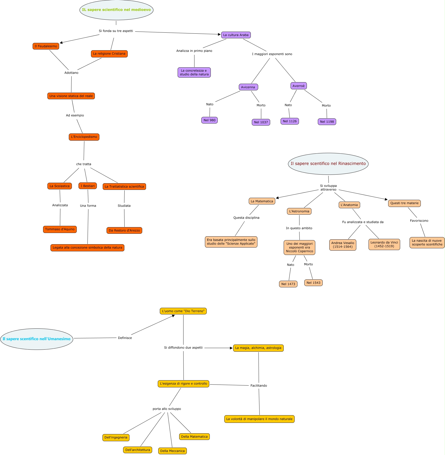Questa Cmap, creata con IHMC CmapTools, contiene informazioni relative a: Rossiello_Saperi scientifici, La Matematica Questa disciplina Era basata principalmente sullo studio delle "Scienze Applicate", Uno dei maggiori esponenti era Niccolò Copernico Morto Nel 1543, L'Anatomia Fu analizzata e studiata da Andrea Vesalio (1514-1564), La Scolastica Analizzata Tommaso d'Aquino, I Bestiari Una forma Legata alla concezione simbolica della natura, La Trattatistica scientifica Studiata Da Restoro d'Arezzo, Il sapere scentifico nel Rinascimento Si sviluppa attraverso L'Astronomia, Avicenna Morto Nel 1037, Il sapere scentifico nel Rinascimento Si sviluppa attraverso L'Anatomia, La cultura Araba I maggiori esponenti sono Averroè, La magia, alchimia, astrologia Facilitando La volontà di manipolare il mondo naturale, IL sapere scientifico nel medioevo Si fonda su tre aspetti La religione Cristiana, L'esigenza di rigore e controllo porta allo sviluppo Della Meccanica, La cultura Araba Analizza in primo piano La concretezza e studio della natura, Avicenna Nato Nel 980, Una visione statica del reale Ad esempio L'Enciclopedismo, Il sapere scentifico nel Rinascimento Si sviluppa attraverso La Matematica, La religione Cristiana Adottano Una visione statica del reale, IL sapere scientifico nel medioevo Si fonda su tre aspetti Il Feudalesimo, L'esigenza di rigore e controllo porta allo sviluppo Dell'ingegneria
