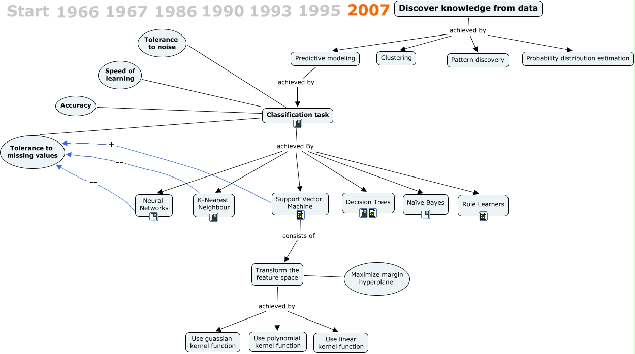 This Concept Map, created with IHMC CmapTools, has information related to: Data_Mining-Techniques_Domain_V3_New_Animation, Classification task Accuracy, Transform the feature space achieved by Use guassian kernel function, Neural Networks + Accuracy, Classification task achieved By Support Vector Machine, Classification task achieved By Rule Learners, Transform the feature space achieved by Use linear kernel function, Neural Networks -- Tolerance to missing values, Classification task achieved By Neural Networks, Support Vector Machine + Tolerance to missing values, K-Nearest Neighbour - Tolerance to noise, Transform the feature space Maximize margin hyperplane, Discover knowledge from data achieved by Predictive modeling, Classification task achieved By Decision Trees, Classification task Speed of learning, K-Nearest Neighbour - Accuracy, Discover knowledge from data achieved by Probability distribution estimation, Classification task achieved By K-Nearest Neighbour, Classification task Tolerance to noise, Support Vector Machine consists of Transform the feature space, Support Vector Machine + Tolerance to noise