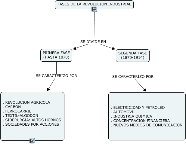 This Concept Map, created with IHMC CmapTools, has information related to: REVOLUCION INDUSTRIAL, FASES DE LA REVOLUCION INDUSTRIAL SE DIVIDE EN PRIMERA FASE (HASTA 1870), FASES DE LA REVOLUCION INDUSTRIAL SE DIVIDE EN SEGUNDA FASE (1870-1914), PRIMERA FASE (HASTA 1870) SE CARACTERIZO POR . REVOLUCION AGRICOLA . CARBON . FERROCARRIL . TEXTIL-ALGODON . SIDERURGIA: ALTOS HORNOS . SOCIEDADES POR ACCIONES, SEGUNDA FASE (1870-1914) SE CARACTERIZO POR . ELECTRICIDAD Y PETROLEO . AUTOMOVIL . INDUSTRIA QUIMICA . CONCENTRACION FINANCIERA . NUEVOS MEDIOS DE COMUNICACION