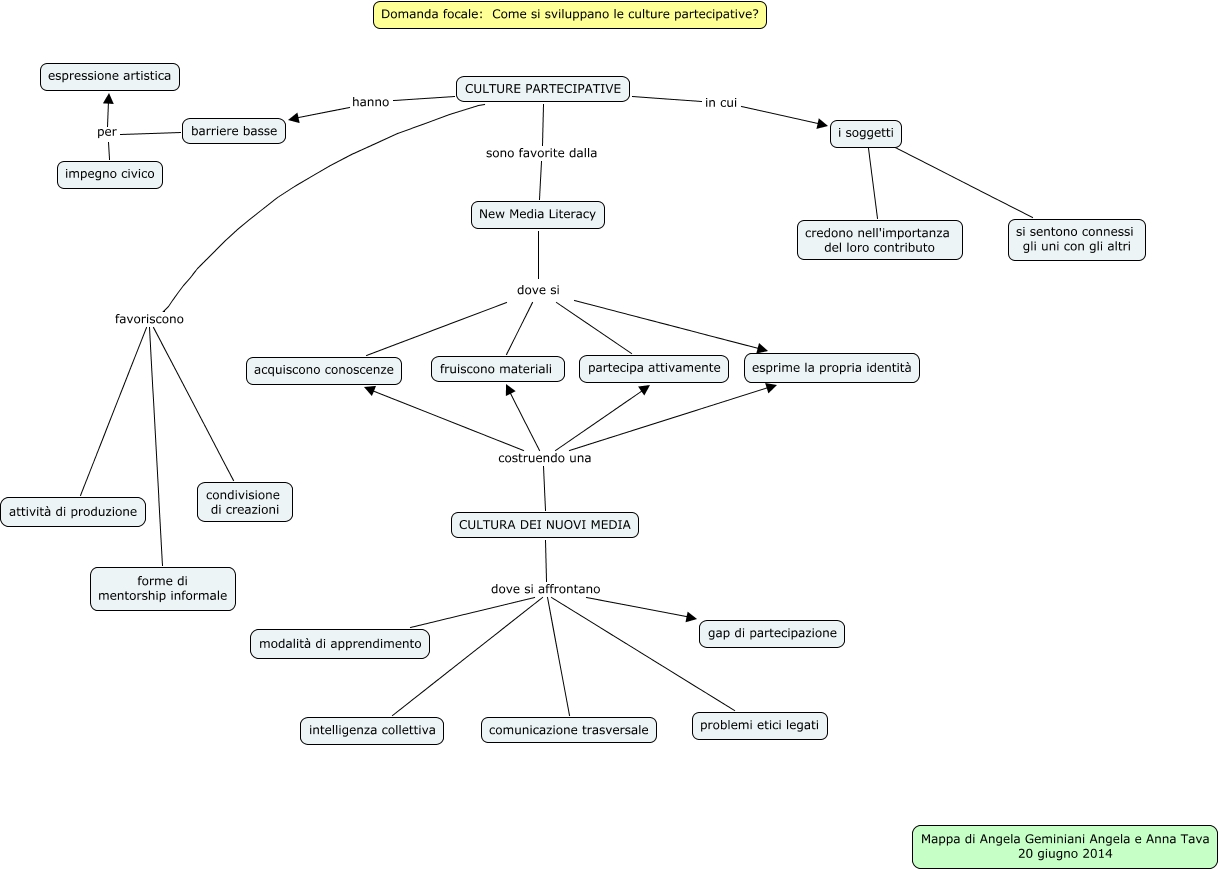 Questa Cmap, creata con IHMC CmapTools, contiene informazioni relative a: prova, barriere basse per impegno civico, CULTURA DEI NUOVI MEDIA costruendo una esprime la propria identità, CULTURA DEI NUOVI MEDIA dove si affrontano comunicazione trasversale, CULTURE PARTECIPATIVE in cui i soggetti, CULTURE PARTECIPATIVE favoriscono attività di produzione, intelligenza collettiva dove si affrontano gap di partecipazione, barriere basse per espressione artistica, New Media Literacy dove si partecipa attivamente, intelligenza collettiva dove si affrontano comunicazione trasversale, problemi etici legati dove si affrontano comunicazione trasversale, New Media Literacy dove si fruiscono materiali, i soggetti ???? si sentono connessi gli uni con gli altri, problemi etici legati dove si affrontano gap di partecipazione, CULTURA DEI NUOVI MEDIA costruendo una acquiscono conoscenze, CULTURA DEI NUOVI MEDIA costruendo una partecipa attivamente, CULTURE PARTECIPATIVE favoriscono condivisione di creazioni, CULTURE PARTECIPATIVE favoriscono forme di mentorship informale, CULTURE PARTECIPATIVE hanno barriere basse, i soggetti ???? credono nell'importanza del loro contributo, CULTURE PARTECIPATIVE sono favorite dalla New Media Literacy