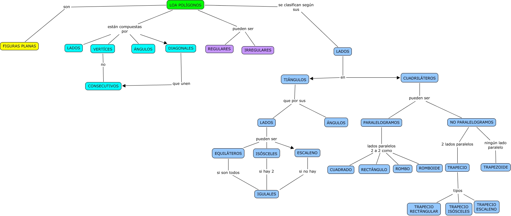 Este Cmap, tiene información relacionada con: LOS POLIGONOS(Allisson), PARALELOGRAMOS lados paralelos 2 a 2 como RECT�?NGULO, LADOS en TI�?NGULOS, LOA POL�?GONOS están compuestas por �?NGULOS, ISÓSCELES si hay 2 IGULALES, TRAPECIO tipos TRAPECIO ISÓSCELES, LOA POL�?GONOS pueden ser REGULARES, TI�?NGULOS que por sus LADOS, PARALELOGRAMOS lados paralelos 2 a 2 como ROMBO, EQUIL�?TEROS si son todos IGULALES, CUADRIL�?TEROS pueden ser NO PARALELOGRAMOS, LADOS en CUADRIL�?TEROS, LADOS pueden ser EQUIL�?TEROS, LOA POL�?GONOS están compuestas por VERT�?CES, ESCALENO si no hay IGULALES, NO PARALELOGRAMOS 2 lados paralelos TRAPECIO, LADOS pueden ser ESCALENO, TRAPECIO tipos TRAPECIO ESCALENO, PARALELOGRAMOS lados paralelos 2 a 2 como CUADRADO, LOA POL�?GONOS son FIGURAS PLANAS, LOA POL�?GONOS pueden ser IRREGULARES