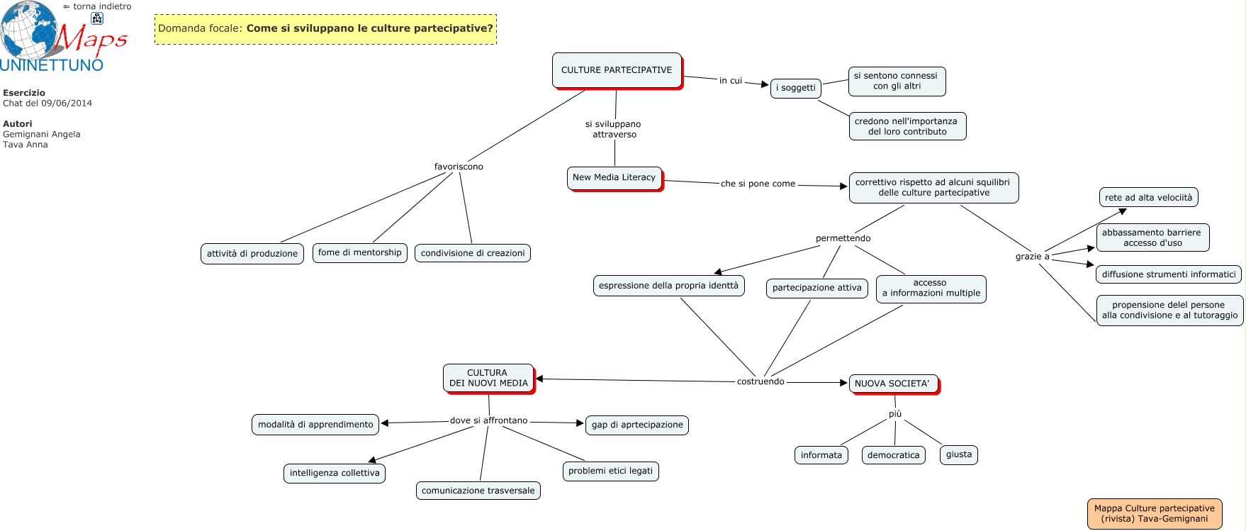 Questa Cmap, creata con IHMC CmapTools, contiene informazioni relative a: 20140620_Gemignani_Tava2, correttivo rispetto ad alcuni squilibri delle culture partecipative grazie a abbassamento barriere accesso d'uso, CULTURA DEI NUOVI MEDIA dove si affrontano problemi etici legati, NUOVA SOCIETA' più democratica, CULTURE PARTECIPATIVE favoriscono fome di mentorship, correttivo rispetto ad alcuni squilibri delle culture partecipative grazie a propensione delel persone alla condivisione e al tutoraggio, correttivo rispetto ad alcuni squilibri delle culture partecipative permettendo partecipazione attiva, correttivo rispetto ad alcuni squilibri delle culture partecipative grazie a rete ad alta velociità, CULTURE PARTECIPATIVE in cui i soggetti, comunicazione trasversale dove si affrontano modalità di apprendimento, CULTURA DEI NUOVI MEDIA dove si affrontano gap di aprtecipazione, accesso a informazioni multiple costruendo NUOVA SOCIETA', partecipazione attiva costruendo CULTURA DEI NUOVI MEDIA, i soggetti ???? credono nell'importanza del loro contributo, correttivo rispetto ad alcuni squilibri delle culture partecipative grazie a diffusione strumenti informatici, CULTURE PARTECIPATIVE favoriscono condivisione di creazioni, CULTURE PARTECIPATIVE si sviluppano attraverso New Media Literacy, comunicazione trasversale dove si affrontano intelligenza collettiva, comunicazione trasversale dove si affrontano gap di aprtecipazione, i soggetti ???? si sentono connessi con gli altri, NUOVA SOCIETA' più giusta