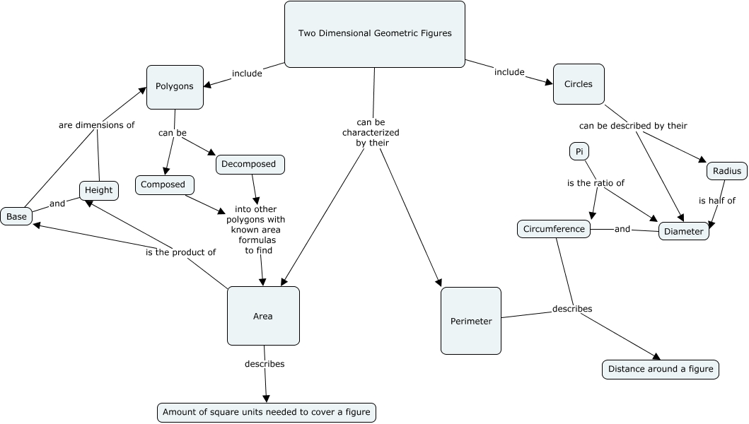 This Concept Map, created with IHMC CmapTools, has information related to: 7th Grade Geometry Concept Map 2, Circumference and Diameter, Area is the product of Base, Perimeter describes Distance around a figure, Base are dimensions of Polygons, Circles can be described by their Radius, Two Dimensional Geometric Figures can be characterized by their Area, Two Dimensional Geometric Figures include Circles, Area describes Amount of square units needed to cover a figure, Decomposed into other polygons with known area formulas to find Area, Area is the product of Height, Height and Base, Circumference describes Distance around a figure, Pi is the ratio of Circumference, Circles can be described by their Diameter, Two Dimensional Geometric Figures include Polygons, Composed into other polygons with known area formulas to find Area, Two Dimensional Geometric Figures can be characterized by their Perimeter, Height are dimensions of Polygons, Polygons can be Composed, Radius is half of Diameter