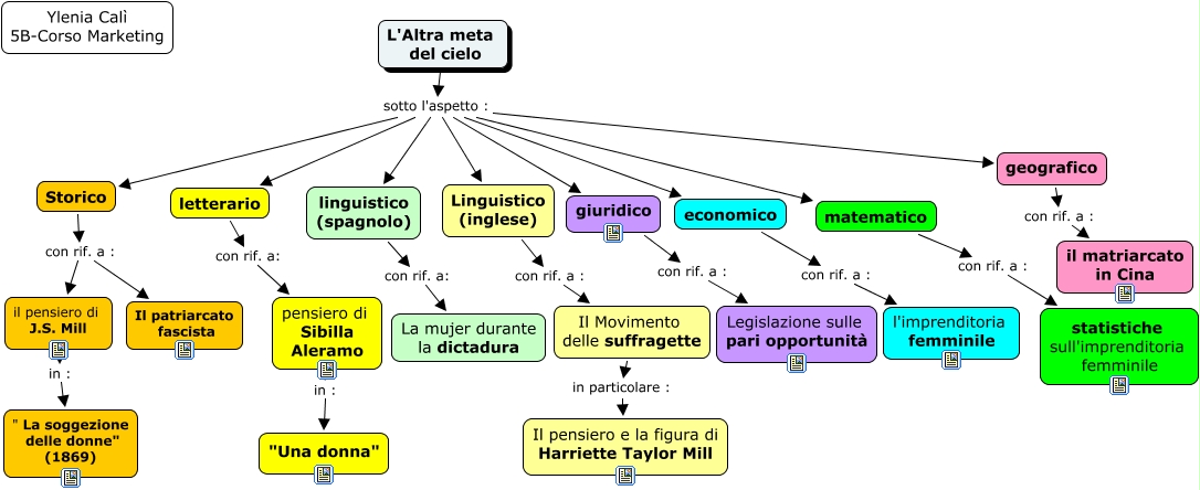 Questa Cmap, creata con IHMC CmapTools, contiene informazioni relative a: Mappa tesina Ylenia Calì - 2014-versione 2, L'Altra meta del cielo sotto l'aspetto : linguistico (spagnolo), L'Altra meta del cielo sotto l'aspetto : matematico, matematico con rif. a : statistiche sull'imprenditoria femminile, L'Altra meta del cielo sotto l'aspetto : Linguistico (inglese), L'Altra meta del cielo sotto l'aspetto : giuridico, L'Altra meta del cielo sotto l'aspetto : Storico, Storico con rif. a : Il patriarcato fascista, economico con rif. a : l'imprenditoria femminile, letterario con rif. a: pensiero di Sibilla Aleramo, geografico con rif. a : il matriarcato in Cina, L'Altra meta del cielo sotto l'aspetto : economico, Linguistico (inglese) con rif. a : Il Movimento delle suffragette, linguistico (spagnolo) con rif. a: La mujer durante la dictadura, L'Altra meta del cielo sotto l'aspetto : geografico, Il Movimento delle suffragette in particolare : Il pensiero e la figura di Harriette Taylor Mill, Storico con rif. a : il pensiero di J.S. Mill, giuridico con rif. a : Legislazione sulle pari opportunità, pensiero di Sibilla Aleramo in : "Una donna", L'Altra meta del cielo sotto l'aspetto : letterario, il pensiero di J.S. Mill in : " La soggezione delle donne" (1869)