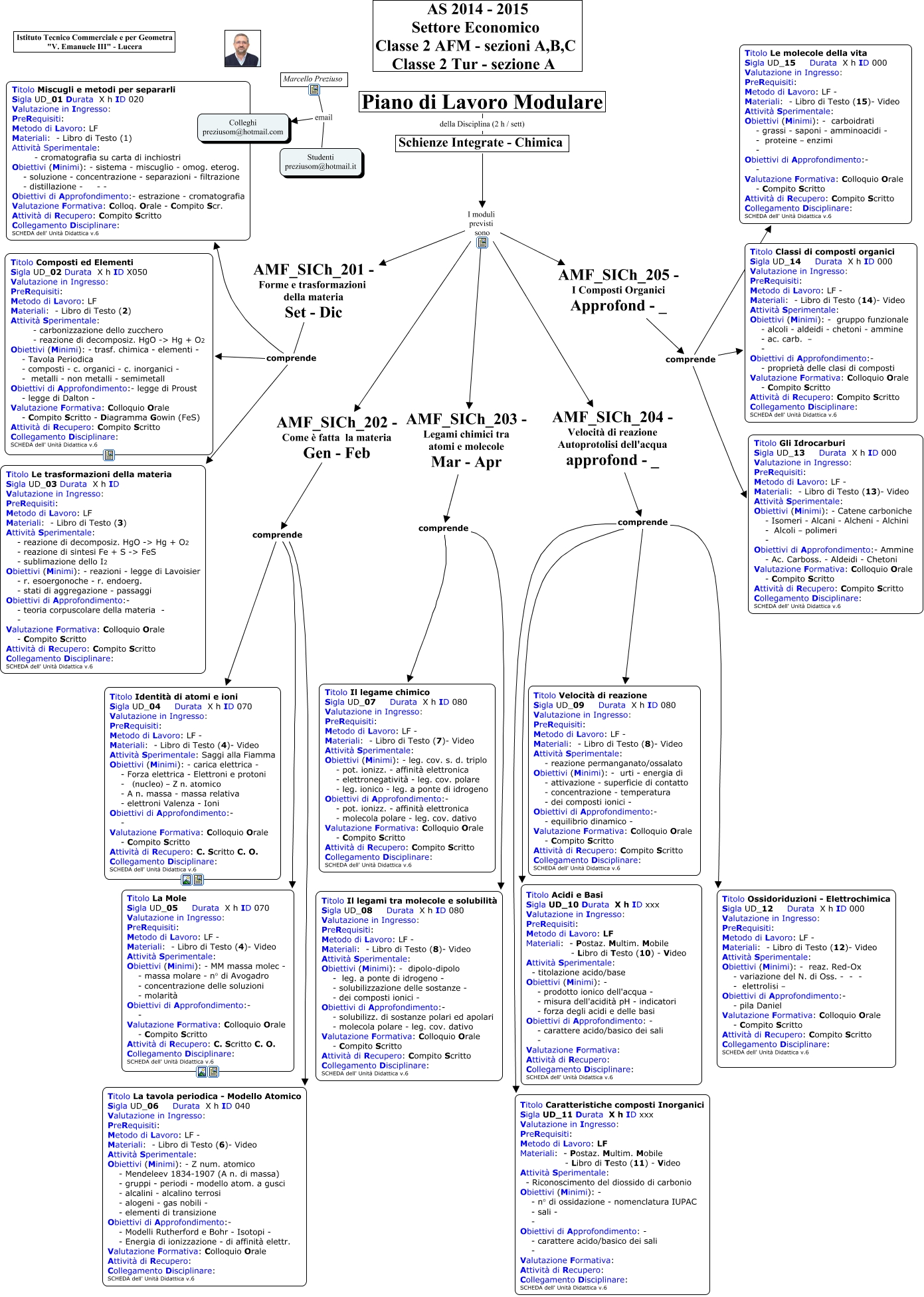 Questa Cmap, creata con IHMC CmapTools, contiene informazioni relative a: E_Sc_Int_CHIMICA_old, Schienze Integrate - Chimica I moduli previsti sono AMF_SICh_201 - Forme e trasformazioni della materia Set - Dic, AMF_SICh_202 - Come è fatta la materia Gen - Feb comprende Titolo Identità di atomi e ioni Sigla UD_04 Durata X h ID 070 Valutazione in Ingresso: PreRequisiti: Metodo di Lavoro: LF - Materiali: - Libro di Testo (4)- Video Attività Sperimentale: Saggi alla Fiamma Obiettivi (Minimi): - carica elettrica - - Forza elettrica - Elettroni e protoni - (nucleo) - Z n. atomico - A n. massa - massa relativa - elettroni Valenza - Ioni Obiettivi di Approfondimento:- - Valutazione Formativa: Colloquio Orale - Compito Scritto Attività di Recupero: C. Scritto C. O. Collegamento Disciplinare: SCHEDA dell' Unità Didattica v.6, AMF_SICh_202 - Come è fatta la materia Gen - Feb comprende Titolo La Mole Sigla UD_05 Durata X h ID 070 Valutazione in Ingresso: PreRequisiti: Metodo di Lavoro: LF - Materiali: - Libro di Testo (4)- Video Attività Sperimentale: Obiettivi (Minimi): - MM massa molec - - massa molare - n° di Avogadro - concentrazione delle soluzioni - molarità Obiettivi di Approfondimento:- - Valutazione Formativa: Colloquio Orale - Compito Scritto Attività di Recupero: C. Scritto C. O. Collegamento Disciplinare: SCHEDA dell' Unità Didattica v.6, AMF_SICh_203 - Legami chimici tra atomi e molecole Mar - Apr comprende Titolo Il legami tra molecole e solubilità Sigla UD_08 Durata X h ID 080 Valutazione in Ingresso: PreRequisiti: Metodo di Lavoro: LF - Materiali: - Libro di Testo (8)- Video Attività Sperimentale: Obiettivi (Minimi): - dipolo-dipolo - leg. a ponte di idrogeno - - solubilizzazione delle sostanze - - dei composti ionici - Obiettivi di Approfondimento:- - solubilizz. di sostanze polari ed apolari - molecola polare - leg. cov. dativo Valutazione Formativa: Colloquio Orale - Compito Scritto Attività di Recupero: Compito Scritto Collegamento Disciplinare: SCHEDA dell' Unità Didattica v.6, Schienze Integrate - Chimica I moduli previsti sono AMF_SICh_202 - Come è fatta la materia Gen - Feb, AMF_SICh_201 - Forme e trasformazioni della materia Set - Dic comprende Titolo Le trasformazioni della materia Sigla UD_03 Durata X h ID Valutazione in Ingresso: PreRequisiti: Metodo di Lavoro: LF Materiali: - Libro di Testo (3) Attività Sperimentale: - reazione di decomposiz. HgO -> Hg + O2 - reazione di sintesi Fe + S -> FeS - sublimazione dello I2 Obiettivi (Minimi): - reazioni - legge di Lavoisier - r. esoergonoche - r. endoerg. - stati di aggregazione - passaggi Obiettivi di Approfondimento:- - teoria corpuscolare della materia - - Valutazione Formativa: Colloquio Orale - Compito Scritto Attività di Recupero: Compito Scritto Collegamento Disciplinare: SCHEDA dell' Unità Didattica v.6, AMF_SICh_204 - Velocità di reazione Autoprotolisi dell'acqua approfond - _ comprende Titolo Ossidoriduzioni - Elettrochimica Sigla UD_12 Durata X h ID 000 Valutazione in Ingresso: PreRequisiti: Metodo di Lavoro: LF - Materiali: - Libro di Testo (12)- Video Attività Sperimentale: Obiettivi (Minimi): - reaz. Red-Ox - variazione del N. di Oss. - - - - elettrolisi - Obiettivi di Approfondimento:- - pila Daniel Valutazione Formativa: Colloquio Orale - Compito Scritto Attività di Recupero: Compito Scritto Collegamento Disciplinare: SCHEDA dell' Unità Didattica v.6, AMF_SICh_201 - Forme e trasformazioni della materia Set - Dic comprende Titolo Composti ed Elementi Sigla UD_02 Durata X h ID X050 Valutazione in Ingresso: PreRequisiti: Metodo di Lavoro: LF Materiali: - Libro di Testo (2) Attività Sperimentale: - carbonizzazione dello zucchero - reazione di decomposiz. HgO -> Hg + O2 Obiettivi (Minimi): - trasf. chimica - elementi - - Tavola Periodica - composti - c. organici - c. inorganici - - metalli - non metalli - semimetall Obiettivi di Approfondimento:- legge di Proust - legge di Dalton - Valutazione Formativa: Colloquio Orale - Compito Scritto - Diagramma Gowin (FeS) Attività di Recupero: Compito Scritto Collegamento Disciplinare: SCHEDA dell' Unità Didattica v.6, AMF_SICh_202 - Come è fatta la materia Gen - Feb comprende Titolo La tavola periodica - Modello Atomico Sigla UD_06 Durata X h ID 040 Valutazione in Ingresso: PreRequisiti: Metodo di Lavoro: LF - Materiali: - Libro di Testo (6)- Video Attività Sperimentale: Obiettivi (Minimi): - Z num. atomico - Mendeleev 1834-1907 (A n. di massa) - gruppi - periodi - modello atom. a gusci - alcalini - alcalino terrosi - alogeni - gas nobili - - elementi di transizione Obiettivi di Approfondimento:- - Modelli Rutherford e Bohr - Isotopi - - Energia di ionizzazione - di affinità elettr. Valutazione Formativa: Colloquio Orale Attività di Recupero: Collegamento Disciplinare: SCHEDA dell' Unità Didattica v.6, Marcello Preziuso email Colleghi preziusom@hotmail.com, AMF_SICh_205 - I Composti Organici Approfond - _ comprende Titolo Le molecole della vita Sigla UD_15 Durata X h ID 000 Valutazione in Ingresso: PreRequisiti: Metodo di Lavoro: LF - Materiali: - Libro di Testo (15)- Video Attività Sperimentale: Obiettivi (Minimi): - carboidrati - grassi - saponi - amminoacidi - - proteine - enzimi - Obiettivi di Approfondimento:- - Valutazione Formativa: Colloquio Orale - Compito Scritto Attività di Recupero: Compito Scritto Collegamento Disciplinare: SCHEDA dell' Unità Didattica v.6, AMF_SICh_204 - Velocità di reazione Autoprotolisi dell'acqua approfond - _ comprende Titolo Velocità di reazione Sigla UD_09 Durata X h ID 080 Valutazione in Ingresso: PreRequisiti: Metodo di Lavoro: LF - Materiali: - Libro di Testo (8)- Video Attività Sperimentale: - reazione permanganato/ossalato Obiettivi (Minimi): - urti - energia di - attivazione - superficie di contatto - concentrazione - temperatura - dei composti ionici - Obiettivi di Approfondimento:- - equilibrio dinamico - Valutazione Formativa: Colloquio Orale - Compito Scritto Attività di Recupero: Compito Scri