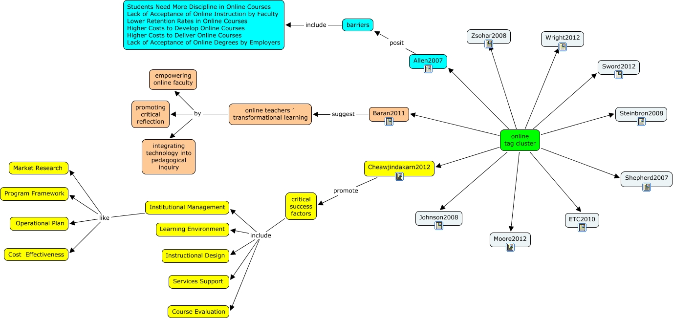 This Concept Map, created with IHMC CmapTools, has information related to: online, online teachers ’ transformational learning by promoting critical reflection, critical success factors include Learning Environment, online tag cluster Wright2012, critical success factors include Institutional Management, online tag cluster Baran2011, online tag cluster Moore2012, Institutional Management like Cost Effectiveness, online tag cluster ETC2010, Institutional Management like Market Research, Institutional Management like Operational Plan, critical success factors include Services Support, Institutional Management like Program Framework, online tag cluster Sword2012, online teachers ’ transformational learning by empowering online faculty, critical success factors include Instructional Design, Baran2011 suggest online teachers ’ transformational learning, online tag cluster Shepherd2007, online tag cluster Steinbron2008, Cheawjindakarn2012 promote critical success factors, online tag cluster Zsohar2008