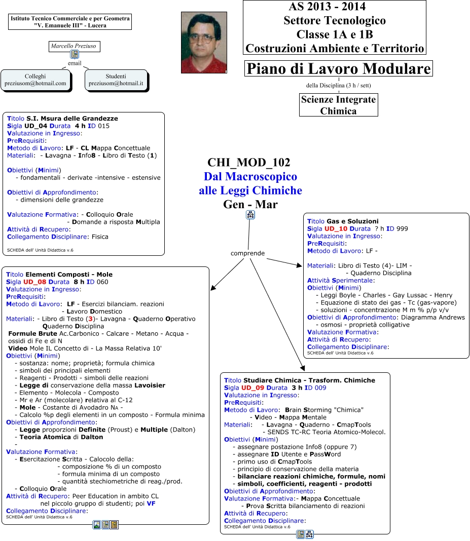 Questa Cmap, creata con IHMC CmapTools, contiene informazioni relative a: T_CHI_MOD_102 Dal Macroscopico alle Leggi Chimiche, CHI_MOD_102 Dal Macroscopico alle Leggi Chimiche Gen - Mar comprende Titolo Elementi Composti - Mole Sigla UD_08 Durata 8 h ID 060 Valutazione in Ingresso: PreRequisiti: Metodo di Lavoro: LF - Esercizi bilanciam. reazioni - Lavoro Domestico Materiali: - Libro di Testo (3)- Lavagna - Quaderno Operativo Quaderno Disciplina Formule Brute Ac.Carbonico - Calcare - Metano - Acqua - ossidi di Fe e di N Video Mole IL Concetto di - La Massa Relativa 10' Obiettivi (Minimi) - sostanza: nome; proprietà; formula chimica - simboli dei principali elementi - Reagenti - Prodotti - simboli delle reazioni - Legge di conservazione della massa Lavoisier - Elemento - Molecola - Composto - Mr e Ar (molecolare) relativa al C-12 - Mole - Costante di Avodadro NA - - Calcolo %p degli elementi in un composto - Formula minima Obiettivi di Approfondimento: - Legge proporzioni Definite (Proust) e Multiple (Dalton) - Teoria Atomica di Dalton - Valutazione Formativa: - Esercitazione Scritta - Calocolo della: - composizione % di un composto - formula minima di un composto - quantità stechiometriche di reag./prod. - Colloquio Orale Attività di Recupero: Peer Education in ambito CL nel piccolo gruppo di studenti; poi VF Collegamento Disciplinare: SCHEDA dell' Unità Didattica v.6, Marcello Preziuso email Colleghi preziusom@hotmail.com, CHI_MOD_102 Dal Macroscopico alle Leggi Chimiche Gen - Mar comprende Titolo Studiare Chimica - Trasform. Chimiche Sigla UD_09 Durata 3 h ID 009 Valutazione in Ingresso: PreRequisiti: Metodo di Lavoro: Brain Storming "Chimica" - Video - Mappa Mentale Materiali: - Lavagna - Quaderno - CmapTools - SENDS TC-RC Teoria Atomico-Molecol. Obiettivi (Minimi) - assegnare postazione Info8 (oppure 7) - assegnare ID Utente e PassWord - primo uso di CmapTools - principio di conservazione della materia - bilanciare reazioni chimiche, formule, nomi - simboli, coefficienti, reagenti - prodotti Obiettivi di Approfondimento: Valutazione Formativa:- Mappa Concettuale - Prova Scritta bilanciamento di reazioni Attività di Recupero: Collegamento Disciplinare: SCHEDA dell' Unità Didattica v.6, Piano di Lavoro Modulare della Disciplina (3 h / sett) Scienze Integrate Chimica, Marcello Preziuso email Studenti preziusom@hotmail.it, CHI_MOD_102 Dal Macroscopico alle Leggi Chimiche Gen - Mar comprende Titolo Gas e Soluzioni Sigla UD_10 Durata ? h ID 999 Valutazione in Ingresso: PreRequisiti: Metodo di Lavoro: LF - Materiali: Libro di Testo (4)- LIM - - Quaderno Disciplina Attività Sperimentale: Obiettivi (Minimi) - Leggi Boyle - Charles - Gay Lussac - Henry - Equazione di stato dei gas - Tc (gas-vapore) - soluzioni - concentrazione M m % p/p v/v Obiettivi di Approfondimento: Diagramma Andrews - osmosi - proprietà colligative Valutazione Formativa: Attività di Recupero: Collegamento Disciplinare: SCHEDA dell' Unità Didattica v.6