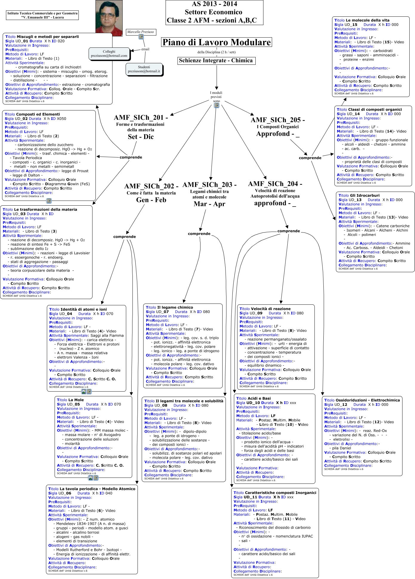 Questa Cmap, creata con IHMC CmapTools, contiene informazioni relative a: E_Sc_Int_CHIMICA, Schienze Integrate - Chimica I moduli previsti sono AMF_SICh_201 - Forme e trasformazioni della materia Set - Dic, AMF_SICh_202 - Come è fatta la materia Gen - Feb comprende Titolo Identità di atomi e ioni Sigla UD_04 Durata X h ID 070 Valutazione in Ingresso: PreRequisiti: Metodo di Lavoro: LF - Materiali: - Libro di Testo (4)- Video Attività Sperimentale: Saggi alla Fiamma Obiettivi (Minimi): - carica elettrica - - Forza elettrica - Elettroni e protoni - (nucleo) - Z n. atomico - A n. massa - massa relativa - elettroni Valenza - Ioni Obiettivi di Approfondimento:- - Valutazione Formativa: Colloquio Orale - Compito Scritto Attività di Recupero: C. Scritto C. O. Collegamento Disciplinare: SCHEDA dell' Unità Didattica v.6, AMF_SICh_202 - Come è fatta la materia Gen - Feb comprende Titolo La Mole Sigla UD_05 Durata X h ID 070 Valutazione in Ingresso: PreRequisiti: Metodo di Lavoro: LF - Materiali: - Libro di Testo (4)- Video Attività Sperimentale: Obiettivi (Minimi): - MM massa molec - - massa molare - n° di Avogadro - concentrazione delle soluzioni - molarità Obiettivi di Approfondimento:- - Valutazione Formativa: Colloquio Orale - Compito Scritto Attività di Recupero: C. Scritto C. O. Collegamento Disciplinare: SCHEDA dell' Unità Didattica v.6, AMF_SICh_203 - Legami chimici tra atomi e molecole Mar - Apr comprende Titolo Il legami tra molecole e solubilità Sigla UD_08 Durata X h ID 080 Valutazione in Ingresso: PreRequisiti: Metodo di Lavoro: LF - Materiali: - Libro di Testo (8)- Video Attività Sperimentale: Obiettivi (Minimi): - dipolo-dipolo - leg. a ponte di idrogeno - - solubilizzazione delle sostanze - - dei composti ionici - Obiettivi di Approfondimento:- - solubilizz. di sostanze polari ed apolari - molecola polare - leg. cov. dativo Valutazione Formativa: Colloquio Orale - Compito Scritto Attività di Recupero: Compito Scritto Collegamento Disciplinare: SCHEDA dell' Unità Didattica v.6, Schienze Integrate - Chimica I moduli previsti sono AMF_SICh_202 - Come è fatta la materia Gen - Feb, AMF_SICh_201 - Forme e trasformazioni della materia Set - Dic comprende Titolo Le trasformazioni della materia Sigla UD_03 Durata X h ID Valutazione in Ingresso: PreRequisiti: Metodo di Lavoro: LF Materiali: - Libro di Testo (3) Attività Sperimentale: - reazione di decomposiz. HgO -> Hg + O2 - reazione di sintesi Fe + S -> FeS - sublimazione dello I2 Obiettivi (Minimi): - reazioni - legge di Lavoisier - r. esoergonoche - r. endoerg. - stati di aggregazione - passaggi Obiettivi di Approfondimento:- - teoria corpuscolare della materia - - Valutazione Formativa: Colloquio Orale - Compito Scritto Attività di Recupero: Compito Scritto Collegamento Disciplinare: SCHEDA dell' Unità Didattica v.6, AMF_SICh_204 - Velocità di reazione Autoprotolisi dell'acqua approfond - _ comprende Titolo Ossidoriduzioni - Elettrochimica Sigla UD_12 Durata X h ID 000 Valutazione in Ingresso: PreRequisiti: Metodo di Lavoro: LF - Materiali: - Libro di Testo (12)- Video Attività Sperimentale: Obiettivi (Minimi): - reaz. Red-Ox - variazione del N. di Oss. - - - - elettrolisi - Obiettivi di Approfondimento:- - pila Daniel Valutazione Formativa: Colloquio Orale - Compito Scritto Attività di Recupero: Compito Scritto Collegamento Disciplinare: SCHEDA dell' Unità Didattica v.6, AMF_SICh_201 - Forme e trasformazioni della materia Set - Dic comprende Titolo Composti ed Elementi Sigla UD_02 Durata X h ID X050 Valutazione in Ingresso: PreRequisiti: Metodo di Lavoro: LF Materiali: - Libro di Testo (2) Attività Sperimentale: - carbonizzazione dello zucchero - reazione di decomposiz. HgO -> Hg + O2 Obiettivi (Minimi): - trasf. chimica - elementi - - Tavola Periodica - composti - c. organici - c. inorganici - - metalli - non metalli - semimetall Obiettivi di Approfondimento:- legge di Proust - legge di Dalton - Valutazione Formativa: Colloquio Orale - Compito Scritto - Diagramma Gowin (FeS) Attività di Recupero: Compito Scritto Collegamento Disciplinare: SCHEDA dell' Unità Didattica v.6, AMF_SICh_202 - Come è fatta la materia Gen - Feb comprende Titolo La tavola periodica - Modello Atomico Sigla UD_06 Durata X h ID 040 Valutazione in Ingresso: PreRequisiti: Metodo di Lavoro: LF - Materiali: - Libro di Testo (6)- Video Attività Sperimentale: Obiettivi (Minimi): - Z num. atomico - Mendeleev 1834-1907 (A n. di massa) - gruppi - periodi - modello atom. a gusci - alcalini - alcalino terrosi - alogeni - gas nobili - - elementi di transizione Obiettivi di Approfondimento:- - Modelli Rutherford e Bohr - Isotopi - - Energia di ionizzazione - di affinità elettr. Valutazione Formativa: Colloquio Orale Attività di Recupero: Collegamento Disciplinare: SCHEDA dell' Unità Didattica v.6, Marcello Preziuso email Colleghi preziusom@hotmail.com, AMF_SICh_205 - I Composti Organici Approfond - _ comprende Titolo Le molecole della vita Sigla UD_15 Durata X h ID 000 Valutazione in Ingresso: PreRequisiti: Metodo di Lavoro: LF - Materiali: - Libro di Testo (15)- Video Attività Sperimentale: Obiettivi (Minimi): - carboidrati - grassi - saponi - amminoacidi - - proteine - enzimi - Obiettivi di Approfondimento:- - Valutazione Formativa: Colloquio Orale - Compito Scritto Attività di Recupero: Compito Scritto Collegamento Disciplinare: SCHEDA dell' Unità Didattica v.6, AMF_SICh_204 - Velocità di reazione Autoprotolisi dell'acqua approfond - _ comprende Titolo Velocità di reazione Sigla UD_09 Durata X h ID 080 Valutazione in Ingresso: PreRequisiti: Metodo di Lavoro: LF - Materiali: - Libro di Testo (8)- Video Attività Sperimentale: - reazione permanganato/ossalato Obiettivi (Minimi): - urti - energia di - attivazione - superficie di contatto - concentrazione - temperatura - dei composti ionici - Obiettivi di Approfondimento:- - equilibrio dinamico - Valutazione Formativa: Colloquio Orale - Compito Scritto Attività di Recupero: Compito Scritto 