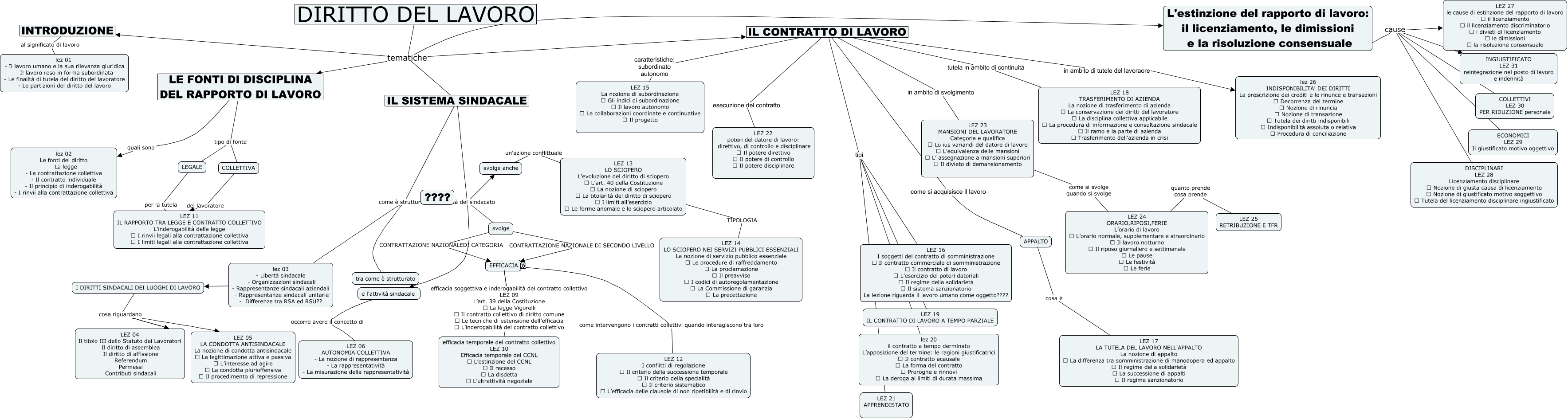 Questa Cmap, creata con IHMC CmapTools, contiene informazioni relative a: mappe diritto del lavoro, I DIRITTI SINDACALI DEI LUOGHI DI LAVORO cosa riguardano LEZ 04 Il titolo III dello Statuto dei Lavoratori Il diritto di assemblea Il diritto di affissione Referendum Permessi Contributi sindacali, APPALTO cosa è LEZ 17 LA TUTELA DEL LAVORO NELL'APPALTO La nozione di appalto La differenza tra somministrazione di manodopera ed appalto Il regime della solidarietà La successione di appalti Il regime sanzionatorio, svolge CONTRATTAZIONE NAZIONALE DI SECONDO LIVELLO LEZ 08 Contratto Integrativo Territoriale od Aziendale di settore - La titolarità negoziale - Il contenuto - La durata, DIRITTO DEL LAVORO tematiche L'estinzione del rapporto di lavoro: il licenziamento, le dimissioni e la risoluzione consensuale, EFFICACIA come intervengono i contratti collettivi quando interagiscono tra loro LEZ 12 I conflitti di regolazione Il criterio della successione temporale Il criterio della specialità Il criterio sistematico L’efficacia delle clausole di non ripetibilità e di rinvio, IL SISTEMA SINDACALE attività del sindacato e l'attività sindacale, IL CONTRATTO DI LAVORO tipi LEZ 16 I soggetti del contratto di somministrazione Il contratto commerciale di somministrazione Il contratto di lavoro L’esercizio dei poteri datoriali Il regime della solidarietà Il sistema sanzionatorio La lezione riguarda il lavoro umano come oggetto????, IL SISTEMA SINDACALE attività del sindacato svolge anche, I DIRITTI SINDACALI DEI LUOGHI DI LAVORO cosa riguardano LEZ 04 Il titolo III dello Statuto dei Lavoratori Il diritto di assemblea Il diritto di affissione Referendum Permessi Contributi sindacali, L'estinzione del rapporto di lavoro: il licenziamento, le dimissioni e la risoluzione consensuale cause ECONOMICI LEZ 29 Il giustificato motivo oggettivo, L'estinzione del rapporto di lavoro: il licenziamento, le dimissioni e la risoluzione consensuale cause DISCIPLINARI LEZ 28 Licenziamento disciplinare Nozione di giusta causa di licenziamento Nozione di giustificato motivo soggettivo Tutela del licenziamento disciplinare ingiustificato, LEZ 23 MANSIONI DEL LAVORATORE Categoria e qualifica Lo ius variandi del datore di lavoro L’equivalenza delle mansioni L’ assegnazione a mansioni superiori Il divieto di demansionamento come si svolge quando si svolge LEZ 24 ORARIO,RIPOSI,FERIE L’orario di lavoro L’orario normale, supplementare e straordinario Il lavoro notturno Il riposo giornaliero e settimanale Le pause Le festività Le ferie, IL CONTRATTO DI LAVORO caratteristiche: subordinato autonomo LEZ 15 La nozione di subordinazione Gli indici di subordinazione Il lavoro autonomo Le collaborazioni coordinate e continuative Il progetto, DIRITTO DEL LAVORO tematiche INTRODUZIONE, LE FONTI DI DISCIPLINA DEL RAPPORTO DI LAVORO tipo di fonte LEGALE, LE FONTI DI DISCIPLINA DEL RAPPORTO DI LAVORO tipo di fonte COLLETTIVA, IL CONTRATTO DI LAVORO tipi LEZ 19 IL CONTRATTO DI LAVORO A TEMPO PARZIALE, LEZ 07 - Le tipologie di CCNL - I soggetti della contrattazione collettiva nazionale- - Il contenuto del CCNL - L’interpretazione del contratto efficacia soggettiva e inderogabilità del contratto collettivo LEZ 09 L’art. 39 della Costituzione La legge Vigorelli Il contratto collettivo di diritto comune Le tecniche di estensione dell’efficacia L’inderogabilità del contratto collettivo efficacia temporale del contratto collettivo LEZ 10 Efficacia temporale del CCNL L’estinzione del CCNL Il recesso La disdetta L’ultrattività negoziale, L'estinzione del rapporto di lavoro: il licenziamento, le dimissioni e la risoluzione consensuale cause COLLETTIVI LEZ 30 PER RIDUZIONE personale, IL SISTEMA SINDACALE come è strutturato lez 03 - Libertà sindacale - Organizzazioni sindacali - Rappresentanze sindacali aziendali - Rappresentanze sindacali unitarie - Differenze tra RSA ed RSU??