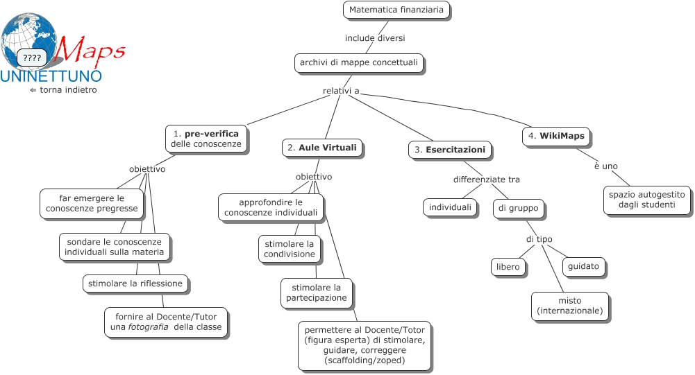Questa Cmap, creata con IHMC CmapTools, contiene informazioni relative a: MEC003MATFIN, 1. pre-verifica delle conoscenze obiettivo fornire al Docente/Tutor una fotografia della classe, archivi di mappe concettuali relativi a 1. pre-verifica delle conoscenze, 3. Esercitazioni differenziate tra di gruppo, 1. pre-verifica delle conoscenze obiettivo stimolare la riflessione, 3. Esercitazioni differenziate tra individuali, 2. Aule Virtuali obiettivo stimolare la condivisione, di gruppo di tipo misto (internazionale), archivi di mappe concettuali relativi a 4. WikiMaps, di gruppo di tipo libero, 4. WikiMaps è uno spazio autogestito dagli studenti, 2. Aule Virtuali obiettivo approfondire le conoscenze individuali, archivi di mappe concettuali relativi a 3. Esercitazioni, 1. pre-verifica delle conoscenze obiettivo sondare le conoscenze individuali sulla materia, 1. pre-verifica delle conoscenze obiettivo far emergere le conoscenze pregresse, 2. Aule Virtuali obiettivo permettere al Docente/Totor (figura esperta) di stimolare, guidare, correggere (scaffolding/zoped), Matematica finanziaria include diversi archivi di mappe concettuali, 2. Aule Virtuali obiettivo stimolare la partecipazione, archivi di mappe concettuali relativi a 2. Aule Virtuali, di gruppo di tipo guidato