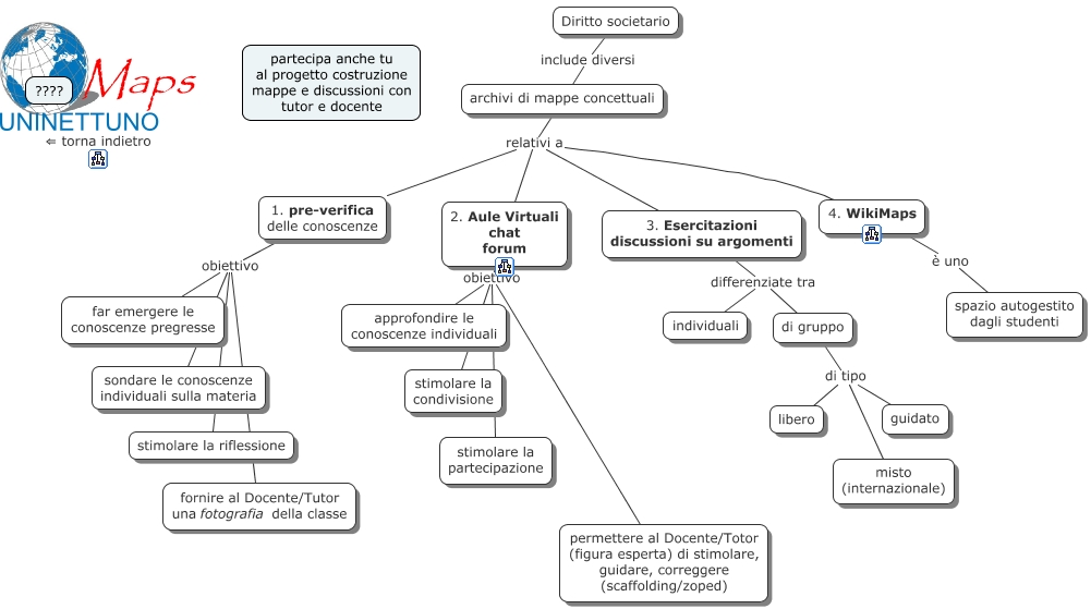 Questa Cmap, creata con IHMC CmapTools, contiene informazioni relative a: MEC005DIRSOC, 2. Aule Virtuali chat forum obiettivo permettere al Docente/Totor (figura esperta) di stimolare, guidare, correggere (scaffolding/zoped), 4. WikiMaps è uno spazio autogestito dagli studenti, 1. pre-verifica delle conoscenze obiettivo far emergere le conoscenze pregresse, 1. pre-verifica delle conoscenze obiettivo sondare le conoscenze individuali sulla materia, di gruppo di tipo misto (internazionale), 3. Esercitazioni discussioni su argomenti differenziate tra individuali, di gruppo di tipo libero, 1. pre-verifica delle conoscenze obiettivo stimolare la riflessione, archivi di mappe concettuali relativi a 4. WikiMaps, 2. Aule Virtuali chat forum obiettivo stimolare la partecipazione, 3. Esercitazioni discussioni su argomenti differenziate tra di gruppo, archivi di mappe concettuali relativi a 1. pre-verifica delle conoscenze, di gruppo di tipo guidato, 2. Aule Virtuali chat forum obiettivo approfondire le conoscenze individuali, 2. Aule Virtuali chat forum obiettivo stimolare la condivisione, archivi di mappe concettuali relativi a 2. Aule Virtuali chat forum, Diritto societario include diversi archivi di mappe concettuali, 1. pre-verifica delle conoscenze obiettivo fornire al Docente/Tutor una fotografia della classe, archivi di mappe concettuali relativi a 3. Esercitazioni discussioni su argomenti