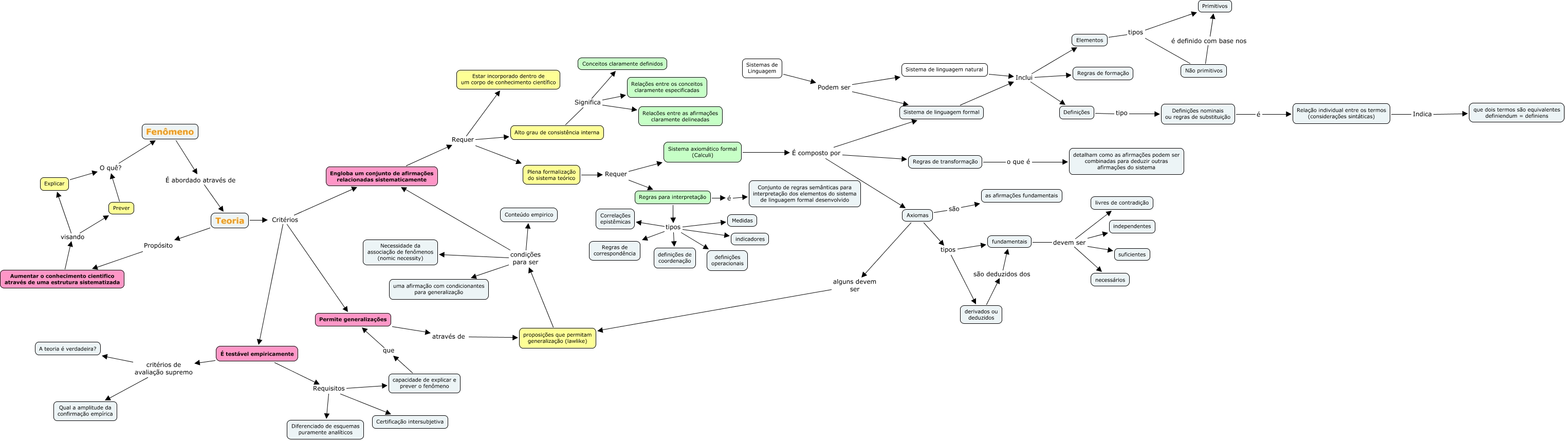 This Concept Map, created with IHMC CmapTools, has information related to: TM-2014-05-07, fundamentais devem ser livres de contradição, Aumentar o conhecimento cientifico através de uma estrutura sistematizada visando Prever, Regras para interpretação tipos definições de coordenação, Sistema axiomático formal (Calculi) É composto por Sistema de linguagem formal, Teoria Propósito Aumentar o conhecimento cientifico através de uma estrutura sistematizada, proposições que permitam generalização (lawlike) condições para ser Engloba um conjunto de afirmações relacionadas sistematicamente, proposições que permitam generalização (lawlike) condições para ser Necessidade da associação de fenômenos (nomic necessity), Prever O quê? Fenômeno, Definições nominais ou regras de substituição é Relação individual entre os termos (considerações sintáticas), fundamentais devem ser suficientes, Sistema de linguagem formal Inclui Definições, Sistemas de Linguagem Podem ser Sistema de linguagem formal, Teoria Critérios É testável empiricamente, Teoria Critérios Permite generalizações, Definições tipo Definições nominais ou regras de substituição, É testável empiricamente Requisitos capacidade de explicar e prever o fenômeno, fundamentais devem ser necessários, Axiomas são as afirmações fundamentais, Elementos tipos Não primitivos, Regras para interpretação tipos Regras de correspondência