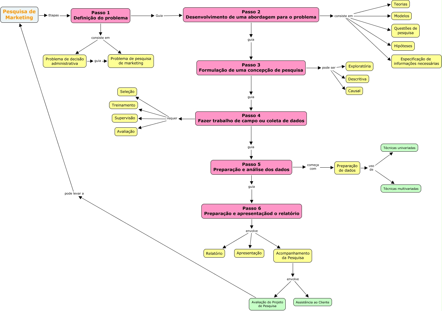 This Concept Map, created with IHMC CmapTools, has information related to: pesquisa, Passo 2 Desenvolvimento de uma abordagem para o problema consiste em Hipóteses, Passo 4 Fazer trabalho de campo ou coleta de dados guia Passo 5 Preparação e análise dos dados, Passo 3 Formulação de uma concepção de pesquisa pode ser Causal, Passo 2 Desenvolvimento de uma abordagem para o problema consiste em Especificação de informações necessárias, Passo 3 Formulação de uma concepção de pesquisa pode ser Descritiva, Passo 4 Fazer trabalho de campo ou coleta de dados requer Supervisão, Passo 4 Fazer trabalho de campo ou coleta de dados requer Treinamento, Passo 6 Preparação e apresentaçãod o relatório envolve Apresentação, Problema de decisão administrativa guia Problema de pesquisa de marketing, Preparação de dados uso de Técnicas univariadas, Acompanhamento da Pesquisa envolve Assistência ao Cliente, Passo 4 Fazer trabalho de campo ou coleta de dados requer Seleção, Passo 3 Formulação de uma concepção de pesquisa pode ser Exploratória, Preparação de dados uso de Técnicas multivariadas, Passo 3 Formulação de uma concepção de pesquisa guia Passo 4 Fazer trabalho de campo ou coleta de dados, Passo 6 Preparação e apresentaçãod o relatório envolve Acompanhamento da Pesquisa, Passo 2 Desenvolvimento de uma abordagem para o problema consiste em Teorias, Passo 1 Definição do problema consiste em Problema de decisão administrativa, Passo 1 Definição do problema Guia Passo 2 Desenvolvimento de uma abordagem para o problema, Passo 5 Preparação e análise dos dados começa com Preparação de dados
