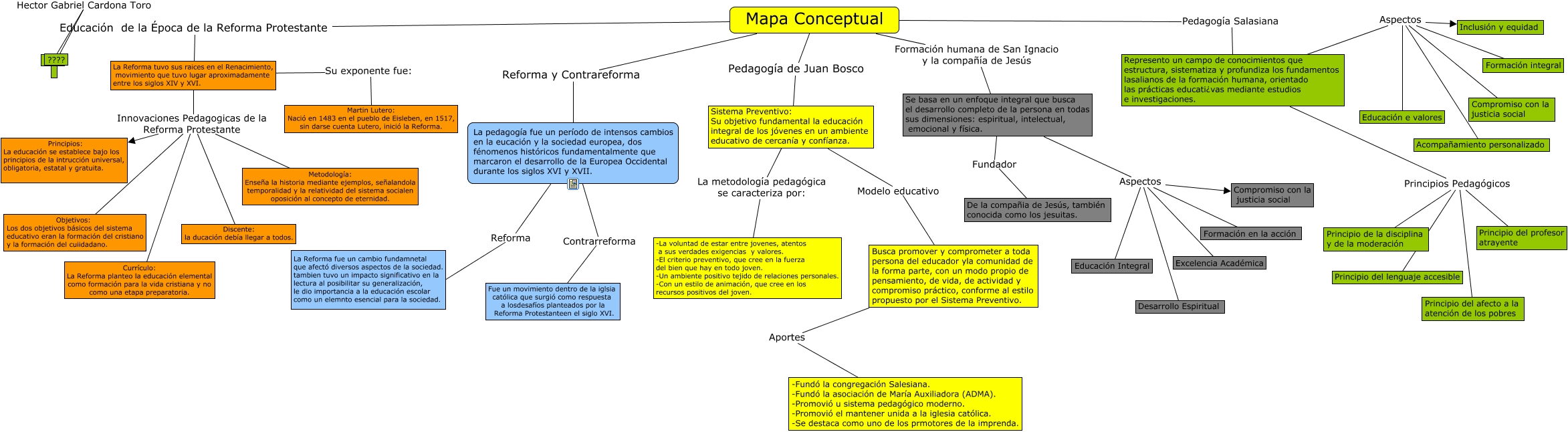 Este Cmap, tiene información relacionada con: Constructionism2.0, Represento un campo de conocimientos que estructura, sistematiza y profundiza los fundamentos lasalianos de la formación humana, orientado las prácticas educati¿vas mediante estudios e investigaciones. Principios Pedagógicos Principio del afecto a la atención de los pobres, La pedagogía fue un período de intensos cambios en la eucación y la sociedad europea, dos fénomenos históricos fundamentalmente que marcaron el desarrollo de la Europea Occidental durante los siglos XVI y XVII. Contrarreforma Fue un movimiento dentro de la iglsia católica que surgió como respuesta a losdesafíos planteados por la Reforma Protestanteen el siglo XVI., Represento un campo de conocimientos que estructura, sistematiza y profundiza los fundamentos lasalianos de la formación humana, orientado las prácticas educati¿vas mediante estudios e investigaciones. Principios Pedagógicos Principio del lenguaje accesible, ???? Hector Gabriel Cardona Toro ????, Sistema Preventivo: Su objetivo fundamental la educación integral de los jóvenes en un ambiente educativo de cercanía y confíanza. La metodología pedagógica se caracteriza por: -La voluntad de estar entre jovenes, atentos a sus verdades exigencias y valores. -El criterio preventivo, que cree en la fuerza del bien que hay en todo joven. -Un ambiente positivo tejido de relaciones personales. -Con un estilo de animación, que cree en los recursos positivos del joven., Represento un campo de conocimientos que estructura, sistematiza y profundiza los fundamentos lasalianos de la formación humana, orientado las prácticas educati¿vas mediante estudios e investigaciones. Aspectos Educación e valores, Se basa en un enfoque integral que busca el desarrollo completo de la persona en todas sus dimensiones: espiritual, intelectual, emocional y física. Fundador De la compañia de Jesús, también conocida como los jesuitas., ???? Su exponente fue: Martin Lutero: Nació en 1483 en el pueblo de Eisleben, en 1517, sin darse cuenta Lutero, inició la Reforma., Mapa Conceptual Formación humana de San Ignacio y la compañía de Jesús Se basa en un enfoque integral que busca el desarrollo completo de la persona en todas sus dimensiones: espiritual, intelectual, emocional y física., La Reforma tuvo sus raices en el Renacimiento, movimiento que tuvo lugar aproximadamente entre los siglos XIV y XVI. Innovaciones Pedagogicas de la Reforma Protestante Discente: la ducación debía llegar a todos., La Reforma tuvo sus raices en el Renacimiento, movimiento que tuvo lugar aproximadamente entre los siglos XIV y XVI. Innovaciones Pedagogicas de la Reforma Protestante Currículo: La Reforma planteo la educación elemental como formación para la vida cristiana y no como una etapa preparatoria., Represento un campo de conocimientos que estructura, sistematiza y profundiza los fundamentos lasalianos de la formación humana, orientado las prácticas educati¿vas mediante estudios e investigaciones. Aspectos Acompañamiento personalizado, Sistema Preventivo: Su objetivo fundamental la educación integral de los jóvenes en un ambiente educativo de cercanía y confíanza. Modelo educativo Busca promover y comprometer a toda persona del educador yla comunidad de la forma parte, con un modo propio de pensamiento, de vida, de actividad y compromiso práctico, conforme al estilo propuesto por el Sistema Preventivo., Represento un campo de conocimientos que estructura, sistematiza y profundiza los fundamentos lasalianos de la formación humana, orientado las prácticas educati¿vas mediante estudios e investigaciones. Principios Pedagógicos Principio de la disciplina y de la moderación, Busca promover y comprometer a toda persona del educador yla comunidad de la forma parte, con un modo propio de pensamiento, de vida, de actividad y compromiso práctico, conforme al estilo propuesto por el Sistema Preventivo. Aportes -Fundó la congregación Salesiana. -Fundó la asociación de María Auxiliadora (ADMA). -Promovió u sistema pedagógico moderno. -Promovió el mantener unida a la iglesia católica. -Se destaca como uno de los prmotores de la imprenda., Se basa en un enfoque integral que busca el desarrollo completo de la persona en todas sus dimensiones: espiritual, intelectual, emocional y física. Aspectos Excelencia Académica, La Reforma tuvo sus raices en el Renacimiento, movimiento que tuvo lugar aproximadamente entre los siglos XIV y XVI. Innovaciones Pedagogicas de la Reforma Protestante Principios: La educación se establece bajo los principios de la intrucción universal, obligatoria, estatal y gratuita., La Reforma tuvo sus raices en el Renacimiento, movimiento que tuvo lugar aproximadamente entre los siglos XIV y XVI. Innovaciones Pedagogicas de la Reforma Protestante Objetivos: Los dos objetivos básicos del sistema educativo eran la formación del cristiano y la formación del cuiidadano., Represento un campo de conocimientos que estructura, sistematiza y profundiza los fundamentos lasalianos de la formación humana, orientado las prácticas educati¿vas mediante estudios e investigaciones. Aspectos Compromiso con la justicia social, Mapa Conceptual Pedagogía Salasiana Represento un campo de conocimientos que estructura, sistematiza y profundiza los fundamentos lasalianos de la formación humana, orientado las prácticas educati¿vas mediante estudios e investigaciones.