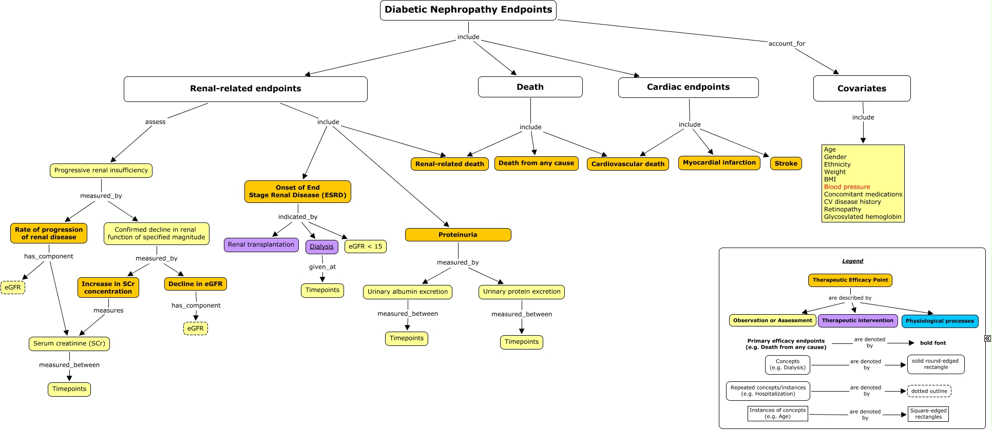 This Concept Map, created with IHMC CmapTools, has information related to: Diabetic_Nephropathy_CMAP_v2, Diabetic Nephropathy Endpoints account_for Covariates, Therapeutic Efficacy Point are described by Observation or Assessment, Rate of progression of renal disease has_component Serum creatinine (SCr), Death include Renal-related death, Cardiac endpoints include Stroke, Therapeutic Efficacy Point are described by Therapeutic intervention, Urinary protein excretion measured_between Timepoints, Primary efficacy endpoints (e.g. Death from any cause) are denoted by bold font, Onset of End Stage Renal Disease (ESRD) indicated_by Dialysis, Proteinuria measured_by Urinary protein excretion, Repeated concepts/instances (e.g. Hospitalization) are denoted by dotted outline, Urinary albumin excretion measured_between Timepoints, Increase in SCr concentration measures Serum creatinine (SCr), Onset of End Stage Renal Disease (ESRD) indicated_by eGFR < 15, Progressive renal insufficiency measured_by Confirmed decline in renal function of specified magnitude, Confirmed decline in renal function of specified magnitude measured_by Increase in SCr concentration, Cardiac endpoints include Myocardial infarction, Renal-related endpoints include Renal-related death, Diabetic Nephropathy Endpoints include Death, Rate of progression of renal disease has_component eGFR