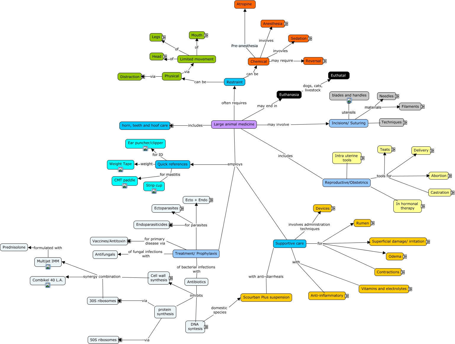 This Concept Map, created with IHMC CmapTools, has information related to: Assignment One - General Large animal medicine, Teats cattle Teat Cannula, 30S ribosomes horse, dog, cat Gentavet, Reproductive/Obstetrics Intrauterine tools Save ewe – prolapsed retainer, Supportive care for Odema, Quick references for ID Ear puncher/clipper, Anti-inflammatory horses only Phenylbutazone, Needles organs Blunt Point Needle, Multijet IMM formulated with Prednisolone, Anesthesia horse, cattle, goats, swine, rabbit Thiopental, Terramycin formulated with Polymyxin B Sulfate, Odema cattle, horse, swine, dog, cat Urolix diuretico, Vitamins and Electrolytes using Dextrose 50%, cell wall synthesis cattle, sheep, pigs, dogs, cats Duphamox, Anti-inflammatory Horse, cattle Banamine, Limited movement of Head, Vitamins and Electrolytes using Vitamin B Complex, Reproductive/Obstetrics in hormone therapy ESTRADIOL Cyponate, 30S ribosomes chicken, turkey, swine Metricycline, Head horse, cattle, ovine Halter, Mouth cattle, horse Drink water mouth guard