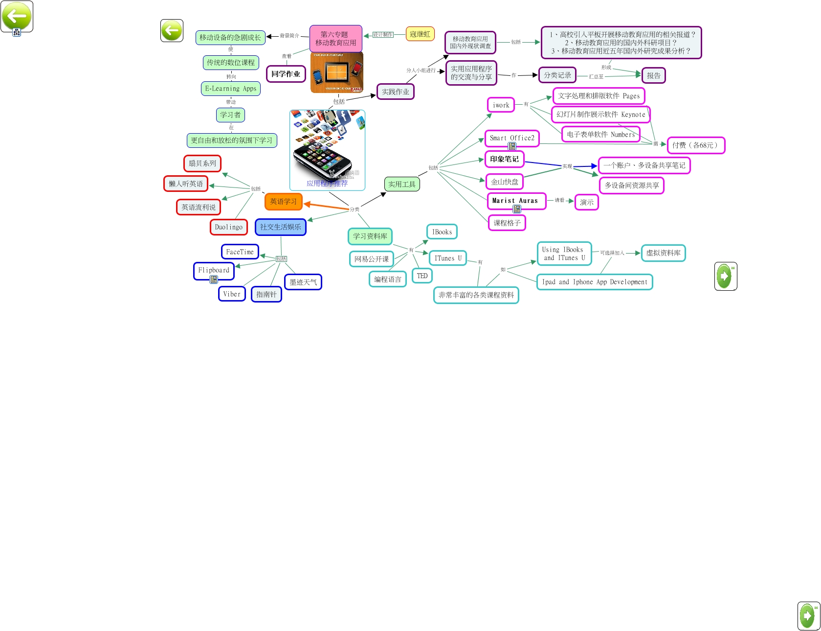 此概念图以 IHMC CmapTools 创建, 内含信息有关于: 移动教育应用, 印象笔记 实现 多设备间资源共享, 学习资料库 有 ITunes U, 实用工具 包括 金山快盘, 实践作业 分人小组进行 实用应用程序 的交流与分享, 学习资料库 有 网易公开课, 英语学习 包括 Duolingo, Marist Auras 请看 演示, 英语学习 包括 英语流利说, 非常丰富的各类课程资料 如 Ipad and Iphone App Development, iwork 有 幻灯片制作展示软件 Keynote, 1、高校引入平板开展移动教育应用的相关报道? 2、移动教育应用的国内外科研项目? 3、移动教育应用近五年国内外研究成果分析? 形成 报告, 社交生活娱乐 包括 墨迹天气, 社交生活娱乐 包括 Flipboard, E-Learning Apps 带动 学习者, 实用工具 包括 Smart Office2, 应用程序推荐 分类 社交生活娱乐, 移动设备的急剧成长 使 传统的数位课程, 印象笔记 实现 一个账户、多设备共享笔记, 金山快盘 实现 多设备间资源共享, 社交生活娱乐 包括 指南针
