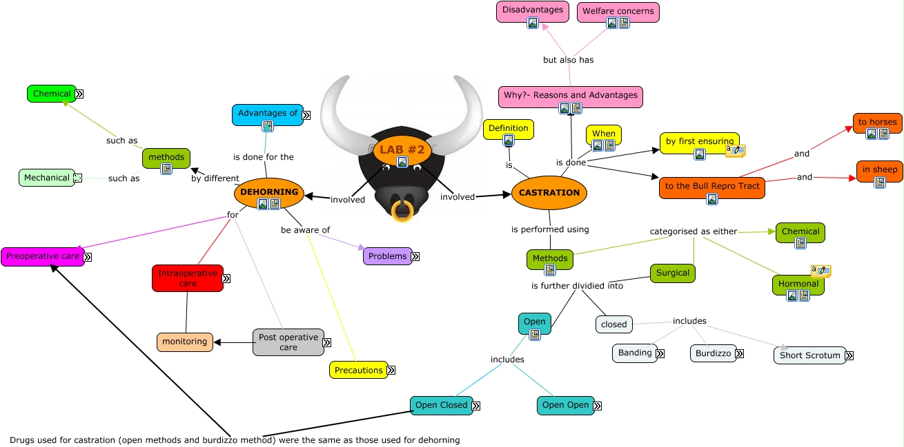 This Concept Map, created with IHMC CmapTools, has information related to: DEHORNING AND CASTRATION, mechanical via Hot Iron, methods such as mechanical, Complications included bleeding blood vessel, Reversal drugs ie Atropine, closed includes Burdizzo, Pre-op including Drugs, advantages of increased sale value, Drugs/Medication for Lidocaine, Open Open has Post-op, Short Scrotum has Advantages and Disadvantages, Precautions be aware of Vital Signs, Open Closed has Pre-op, Preoperative care includes Physical Exam, LAB #2 involved CASTRATION, CASTRATION is done When, closed includes Banding, Post operative care includes recovery, Intra-op including Methods, Methods categorised as either Hormonal, CASTRATION is Definition