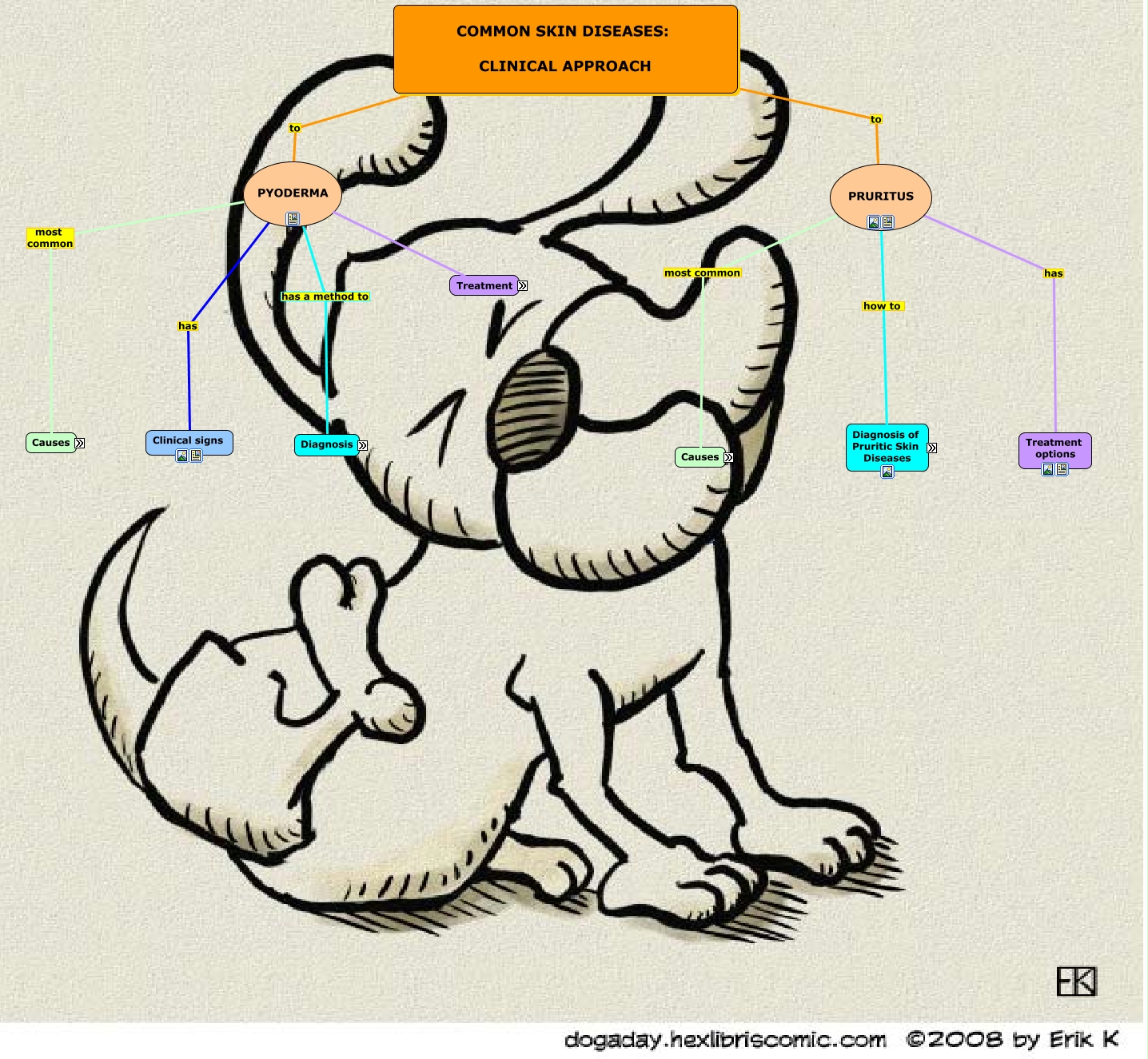 This Concept Map, created with IHMC CmapTools, has information related to: Clinical Pharmacology assignment 2, Clinical signs of Scratching, depends on whether the case is Generalised or deep, Demodex such as Ectoparasites, PYODERMA Treatment depends on whether the case, Clinical signs of Alopecia, PYODERMA Treatment depends on whether the case, Causes are Allergies, COMMON SKIN DISEASES: CLINICAL APPROACH to PRURITUS, PRURITUS how to Diagnosis of Pruritic Skin Diseases, depends on whether the case is For maintenance, Diagnosis of Pruritic Skin Diseases using surface culture, Infections e.g Pyoderma, Diagnosis of Pruritic Skin Diseases using Tape preparation, Allergies ???? Clinical signs, Infections e.g. Dermatophytes, depends on whether the case is Very pruritic, Allergies such as Cutaneous adverse food reactions, Causes are Ectoparasites, Diagnosed by Dermatohyte culture, Causes are Infections