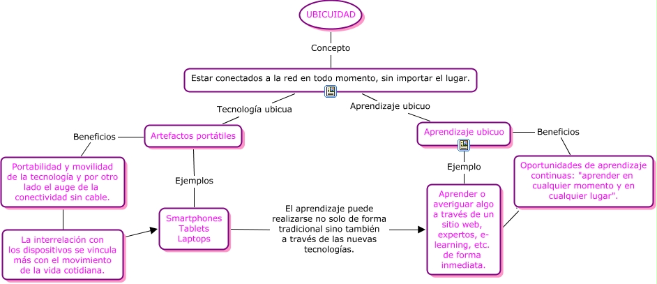Este Cmap, tiene información relacionada con: Ubicuidad, UBICUIDAD Concepto Estar conectados a la red en todo momento, sin importar el lugar., Artefactos portátiles Ejemplos Smartphones Tablets Laptops, Estar conectados a la red en todo momento, sin importar el lugar. Aprendizaje ubicuo Aprendizaje ubicuo, La interrelación con los dispositivos se vincula más con el movimiento de la vida cotidiana. ???? Smartphones Tablets Laptops, Aprendizaje ubicuo Ejemplo Aprender o averiguar algo a través de un sitio web, expertos, e- learning, etc. de forma inmediata., Oportunidades de aprendizaje continuas: "aprender en cualquier momento y en cualquier lugar". ???? Aprender o averiguar algo a través de un sitio web, expertos, e- learning, etc. de forma inmediata., Artefactos portátiles Beneficios Portabilidad y movilidad de la tecnología y por otro lado el auge de la conectividad sin cable., Smartphones Tablets Laptops El aprendizaje puede realizarse no solo de forma tradicional sino también a través de las nuevas tecnologías. Aprender o averiguar algo a través de un sitio web, expertos, e- learning, etc. de forma inmediata., Estar conectados a la red en todo momento, sin importar el lugar. Tecnología ubicua Artefactos portátiles, Portabilidad y movilidad de la tecnología y por otro lado el auge de la conectividad sin cable. ???? La interrelación con los dispositivos se vincula más con el movimiento de la vida cotidiana., Aprendizaje ubicuo Beneficios Oportunidades de aprendizaje continuas: "aprender en cualquier momento y en cualquier lugar".