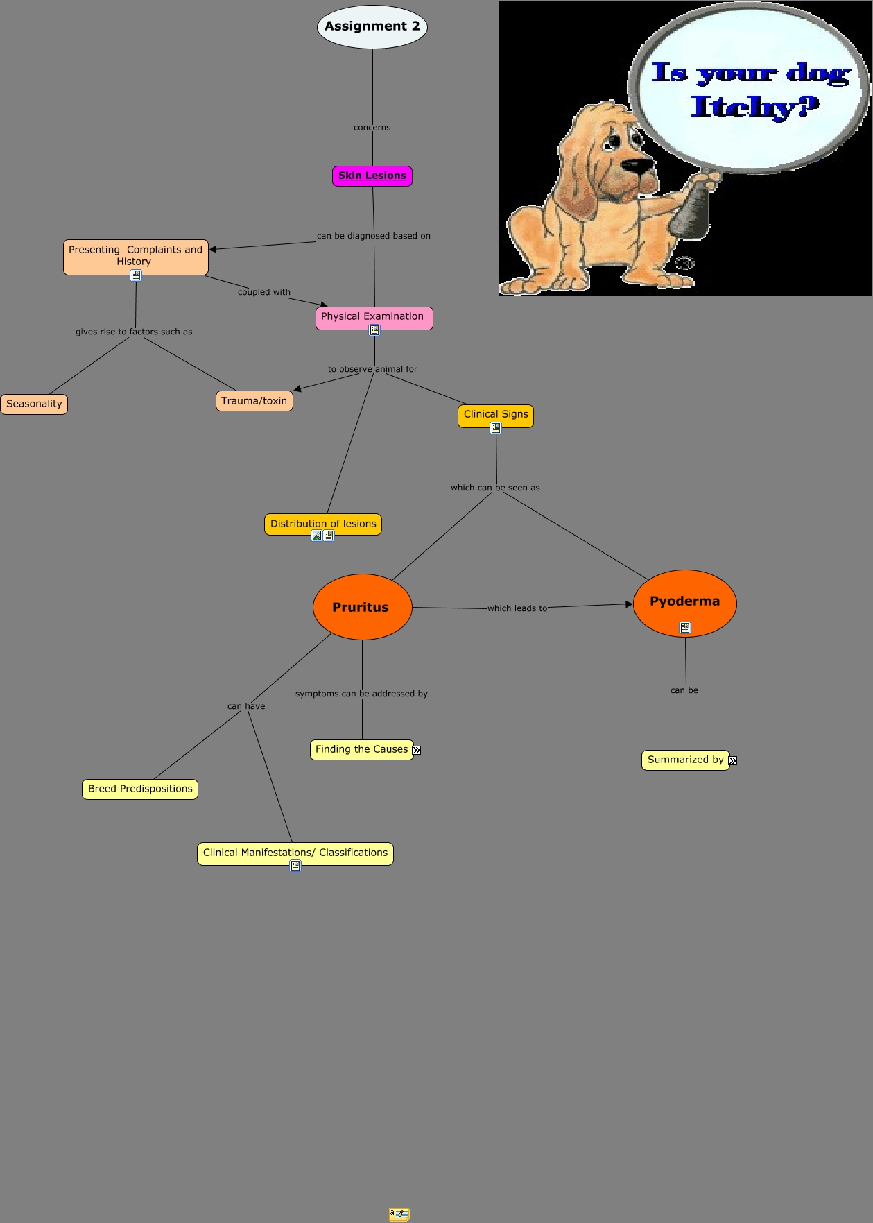 This Concept Map, created with IHMC CmapTools, has information related to: Assignment 2 Flow, Fungal Tx did not work, follow with Food Allegry Tx, Staph infection use Diagnostics, Clinical Manifestations / Classifications Based on cconclusions based on Diagnostic Testing, Fungus use Diagnostics, Atopic Dermatitis Tx did not work, follow with Allergen Immnotherapy, Clinical Signs which can be seen as Pyoderma, Clinical Manifestations / Classifications that can give rise to Complications, Treated Based on cconclusions based on Diagnostic Testing, Pyoderma can be Managed, Skin Lesions can be diagnosed based on Physical Examination, Staph Infection Tx did not work, follow with Fungal Tx, Food Allegry Tx did not work, follow with Atopic Dermatitis Tx, Predisposing Factors influence occurance and Clinical Manifestations / Classifications, Ectoparasites use Diagnostics, Food Allegry Tx worked No symptoms, Presenting Complaints and History gives rise to factors such as Seasonality, Ectoparasite Tx did not work, follow with Staph Infection Tx, Fungus leads to Fungal Tx, Staph infection use Treatment, Fungus use Treatment