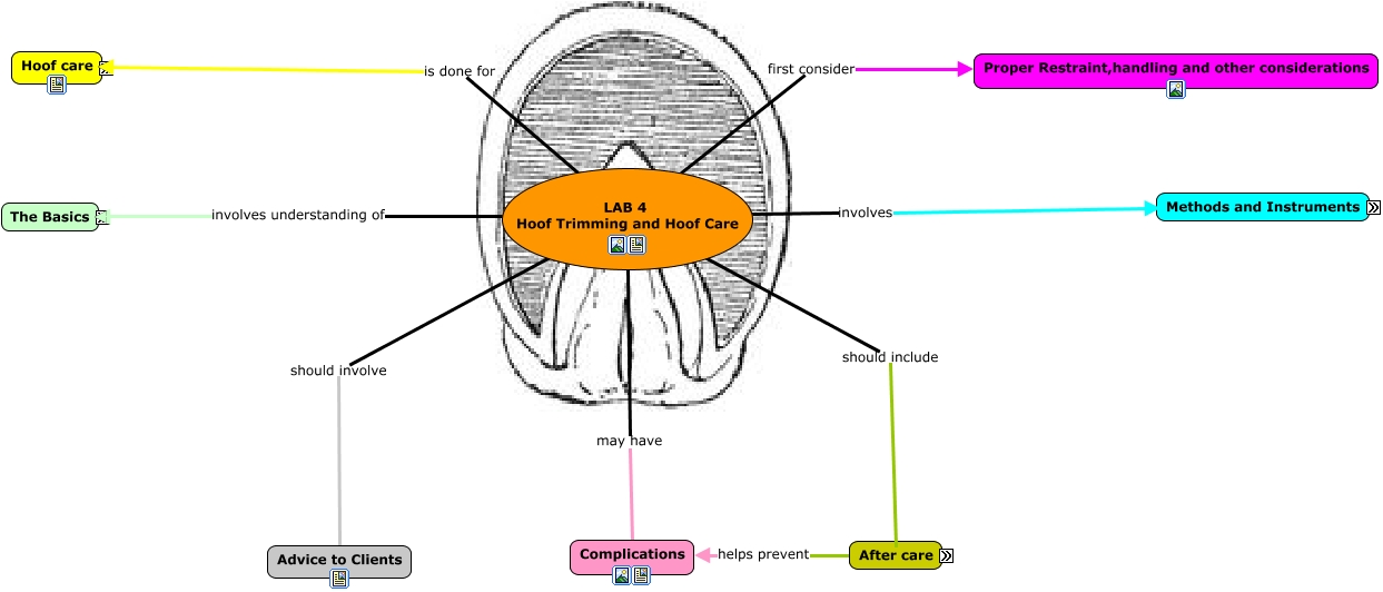 This Concept Map, created with IHMC CmapTools, has information related to: Hoof Trimming and Hoof Care, LAB 4 Hoof Trimming and Hoof Care should involve Advice to Clients, Methods and Instruments such as Hoof clippers, LAB 4 Hoof Trimming and Hoof Care should include After-care, LAB 4 Hoof Trimming and Hoof Care may have Complications, LAB 4 Hoof Trimming and Hoof Care is done for How often, LAB 4 Hoof Trimming and Hoof Care involves understanding of Terms, After-care includes using Spray on Antibiotics, LAB 4 Hoof Trimming and Hoof Care is done for Why ?, LAB 4 Hoof Trimming and Hoof Care involves understanding of Anatomy of the hoof, After-care includes using Hoof blocks, LAB 4 Hoof Trimming and Hoof Care first consider Proper Restraint,handling and other considerations, Methods and Instruments such as Hoof Testers, LAB 4 Hoof Trimming and Hoof Care involves understanding of Nutrition, How often in addition to Footbaths, How often in addition to regular cleaning, LAB 4 Hoof Trimming and Hoof Care involves Methods and Instruments, Methods and Instruments such as Hoof Knife, After care helps prevent Complications, Methods and Instruments such as Hoof Pick, Methods and Instruments such as Power Tools