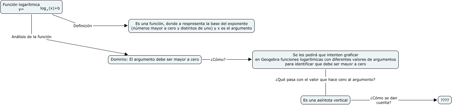 y= </mtext> <mmultiscripts> <mtext> log </mtext> <mtext> a </mtext> <none/> </mmultiscripts> <mtext> (x)+b </mtext> </mrow> </math> Definición Es una función, donde a respresenta la base del exponente (números mayor a cero y distintos de uno) y x es el argumento, Dominio: El argumento debe ser mayor a cero ¿Cómo? Se les pedirá que intenten graficar en Geogebra funciones logarítmicas con diferentes valores de argumentos para identificar que debe ser mayor a cero, Se les pedirá que intenten graficar en Geogebra funciones logarítmicas con diferentes valores de argumentos para identificar que debe ser mayor a cero ¿Qué pasa con el valor que hace cero al argumento? Es una asíntota vertical, Es una asíntota vertical ¿Cómo se dan cuenta? ????, <math xmlns="http://www.w3.org/1998/Math/MathML"> <mrow> <mtext> Función logarítmica