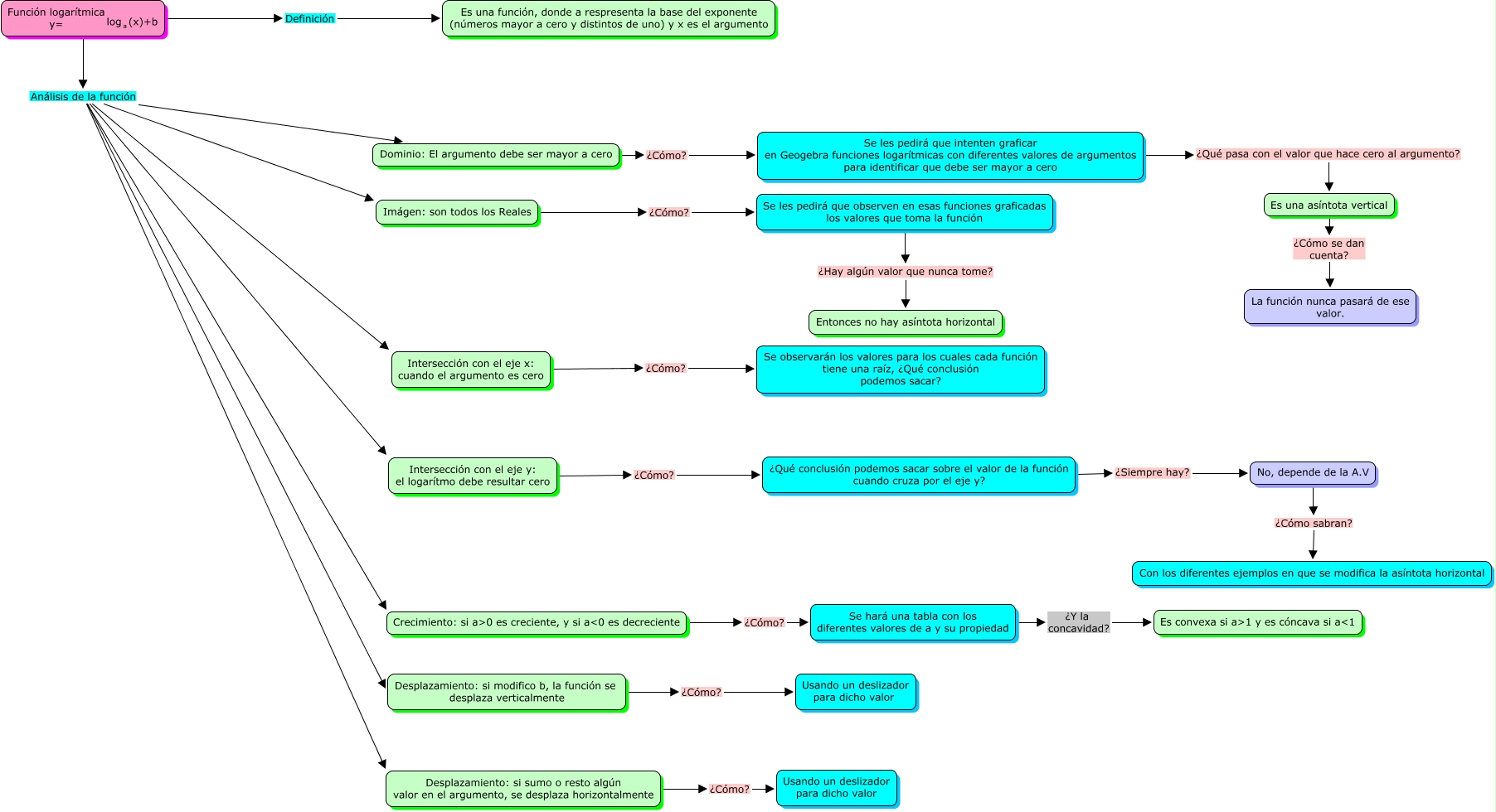 y= </mtext> <mmultiscripts> <mtext> log </mtext> <mtext> a </mtext> <none/> </mmultiscripts> <mtext> (x)+b </mtext> </mrow> </math> Análisis de la función Dominio: El argumento debe ser mayor a cero, Se les pedirá que intenten graficar en Geogebra funciones logarítmicas con diferentes valores de argumentos para identificar que debe ser mayor a cero ¿Qué pasa con el valor que hace cero al argumento? Es una asíntota vertical, <math xmlns="http://www.w3.org/1998/Math/MathML"> <mrow> <mtext> Función logarítmica