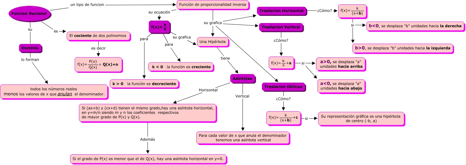 Este Cmap, tiene información relacionada con: Funcion Racional, Funcion Racional su Dominio, Función de proporcionalidad inversa su grafica Traslacion Vertical, Traslacion Vertical ¿Cómo? <math xmlns="http://www.w3.org/1998/Math/MathML"> <mrow> <mtext> f(x)= </mtext> <mfrac> <mtext> k </mtext> <mtext> x </mtext> </mfrac> <mtext> +a </mtext> </mrow> </math>, <math xmlns="http://www.w3.org/1998/Math/MathML"> <mrow> <mtext> f(x)= </mtext> <mfrac> <mtext> k </mtext> <mtext> (x+b) </mtext> </mfrac> </mrow> </math> si bɘ, se desplaza "b" unidades hacia la derecha, <math xmlns="http://www.w3.org/1998/Math/MathML"> <mrow> <mtext> f(x)= </mtext> <mfrac> <mtext> k </mtext> <mtext> (x+b) </mtext> </mfrac> <mtext> +c </mtext> </mrow> </math> si Su representación gráfica es una hipérbola de centro (-b, a), <math xmlns="http://www.w3.org/1998/Math/MathML"> <mrow> <mtext> f(x)= </mtext> <mfrac> <mtext> k </mtext> <mtext> x </mtext> </mfrac> </mrow> </math> para k > 0 la función es decreciente, Si (ax+b) y (cx+d) tienen el mismo grado,hay una asíntota horizontal, en y=m/n siendo m y n los coeficientes respectivos de mayor grado de P(x) y Q(x). Además Si el grado de P(x) es menor que el de Q(x), hay una asíntota horizontal en y=0., Dominio lo forman todos los números reales menos los valores de x que anulan el denominador., <math xmlns="http://www.w3.org/1998/Math/MathML"> <mrow> <mtext> f(x)= </mtext> <mfrac> <mtext> k </mtext> <mtext> x </mtext> </mfrac> </mrow> </math> para k < 0 la función es creciente, <math xmlns="http://www.w3.org/1998/Math/MathML"> <mrow> <mtext> f(x)= </mtext> <mfrac> <mtext> k </mtext> <mtext> x </mtext> </mfrac> <mtext> +a </mtext> </mrow> </math> si aɘ, se desplaza "a" unidades hacia abajo, El cociente de dos polinomios es decir <math xmlns="http://www.w3.org/1998/Math/MathML"> <mrow> <mtext> f(x)= </mtext> <mfrac> <mtext> P(x) </mtext> <mtext> Q(x) </mtext> </mfrac> <mtext> ∧ Q(x)≠o </mtext> </mrow> </math>, <math xmlns="http://www.w3.org/1998/Math/MathML"> <mrow> <mtext> f(x)= </mtext> <mfrac> <mtext> k </mtext> <mtext> x </mtext> </mfrac> <mtext> +a </mtext> </mrow> </math> si aɬ, se desplaza "a" unidades hacia arriba, Traslacion Horizontal ¿Cómo? <math xmlns="http://www.w3.org/1998/Math/MathML"> <mrow> <mtext> f(x)= </mtext> <mfrac> <mtext> k </mtext> <mtext> (x+b) </mtext> </mfrac> </mrow> </math>, Función de proporcionalidad inversa su grafica Traslacion Horizontal, Traslacion Oblicua ¿Cómo? <math xmlns="http://www.w3.org/1998/Math/MathML"> <mrow> <mtext> f(x)= </mtext> <mfrac> <mtext> k </mtext> <mtext> (x+b) </mtext> </mfrac> <mtext> +c </mtext> </mrow> </math>, <math xmlns="http://www.w3.org/1998/Math/MathML"> <mrow> <mtext> f(x)= </mtext> <mfrac> <mtext> k </mtext> <mtext> (x+b) </mtext> </mfrac> </mrow> </math> si bɬ, se desplaza "b" unidades hacia la izquierda, Funcion Racional es El cociente de dos polinomios, Función de proporcionalidad inversa su grafica Una Hipérbola, Funcion Racional un tipo de funcion Función de proporcionalidad inversa, Función de proporcionalidad inversa su grafica Traslacion Oblicua