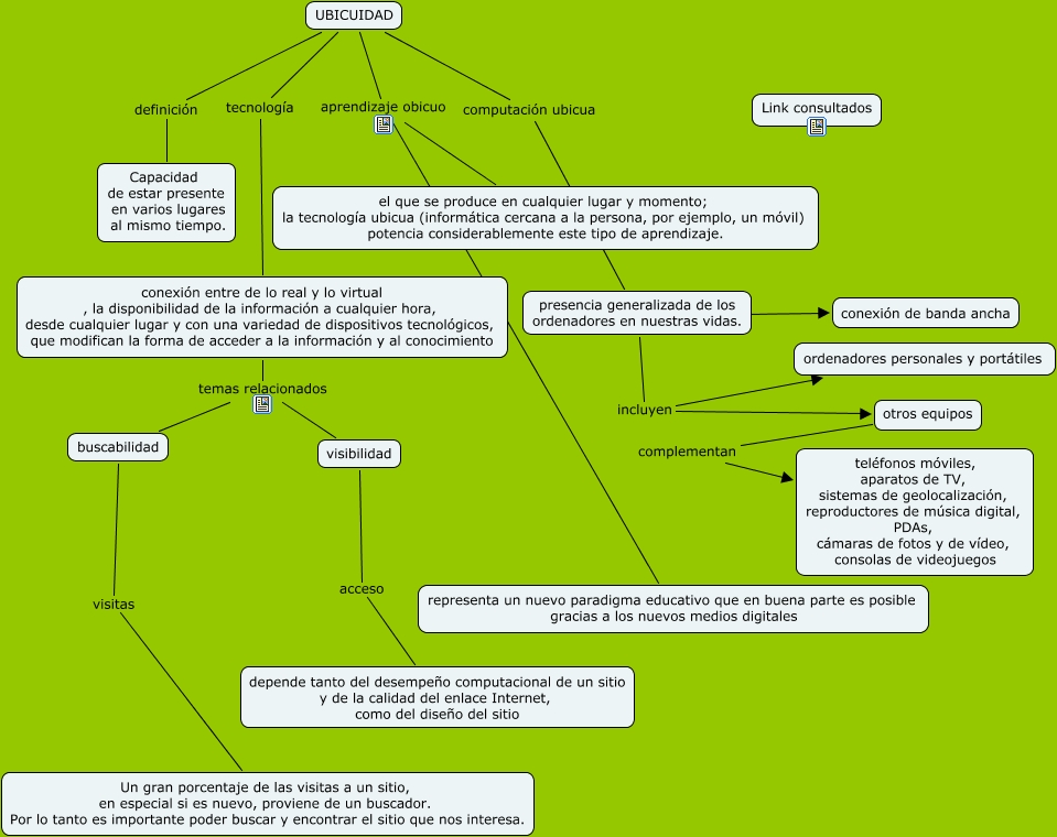 Este Cmap, tiene información relacionada con: Sin Título, UBICUIDAD aprendizaje obicuo el que se produce en cualquier lugar y momento; la tecnología ubicua (informática cercana a la persona, por ejemplo, un móvil) potencia considerablemente este tipo de aprendizaje., UBICUIDAD tecnología conexión entre de lo real y lo virtual , la disponibilidad de la información a cualquier hora, desde cualquier lugar y con una variedad de dispositivos tecnológicos, que modifican la forma de acceder a la información y al conocimiento, conexión entre de lo real y lo virtual , la disponibilidad de la información a cualquier hora, desde cualquier lugar y con una variedad de dispositivos tecnológicos, que modifican la forma de acceder a la información y al conocimiento temas relacionados buscabilidad, presencia generalizada de los ordenadores en nuestras vidas. ???? conexión de banda ancha, UBICUIDAD definición Capacidad de estar presente en varios lugares al mismo tiempo., presencia generalizada de los ordenadores en nuestras vidas. incluyen otros equipos, conexión entre de lo real y lo virtual , la disponibilidad de la información a cualquier hora, desde cualquier lugar y con una variedad de dispositivos tecnológicos, que modifican la forma de acceder a la información y al conocimiento temas relacionados visibilidad, UBICUIDAD aprendizaje obicuo representa un nuevo paradigma educativo que en buena parte es posible gracias a los nuevos medios digitales, UBICUIDAD computación ubicua presencia generalizada de los ordenadores en nuestras vidas., presencia generalizada de los ordenadores en nuestras vidas. incluyen ordenadores personales y portátiles, buscabilidad visitas Un gran porcentaje de las visitas a un sitio, en especial si es nuevo, proviene de un buscador. Por lo tanto es importante poder buscar y encontrar el sitio que nos interesa., visibilidad acceso depende tanto del desempeño computacional de un sitio y de la calidad del enlace Internet, como del diseño del sitio, otros equipos complementan teléfonos móviles, aparatos de TV, sistemas de geolocalización, reproductores de música digital, PDAs, cámaras de fotos y de vídeo, consolas de videojuegos