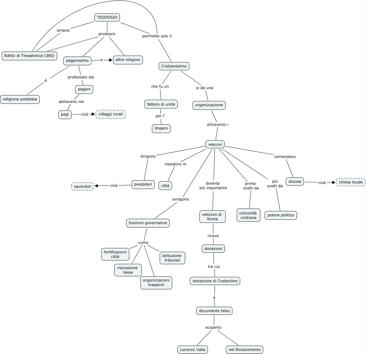 Questa Cmap, creata con IHMC CmapTools, contiene informazioni relative a: teodosio, Editto di Tessalonica (380) proibisce altre religioni, vescovi dirigono presbiteri, diocesi cioè chiesa locale, donazioni tra cui donazione di Costantino, paganesimo e altre religioni, funzioni governative come istituzione tribunali, funzioni governative come riscossione tasse, pagani abitavano nei pagi, pagi cioè villaggi rurali, funzioni governative come fortificazioni città, TEODOSIO proibisce altre religioni, Cristianesimo si dà una organizzazione, vescovi diventa più importante vescovo di Roma, organizzazione attraverso i vescovi, paganesimo è religione politeista, documento falso scoperto Lorenzo Valla, documento falso scoperto nel Rinascimento, vescovi risiedono in città, paganesimo professato dai pagani, fattore di unità per l' Impero