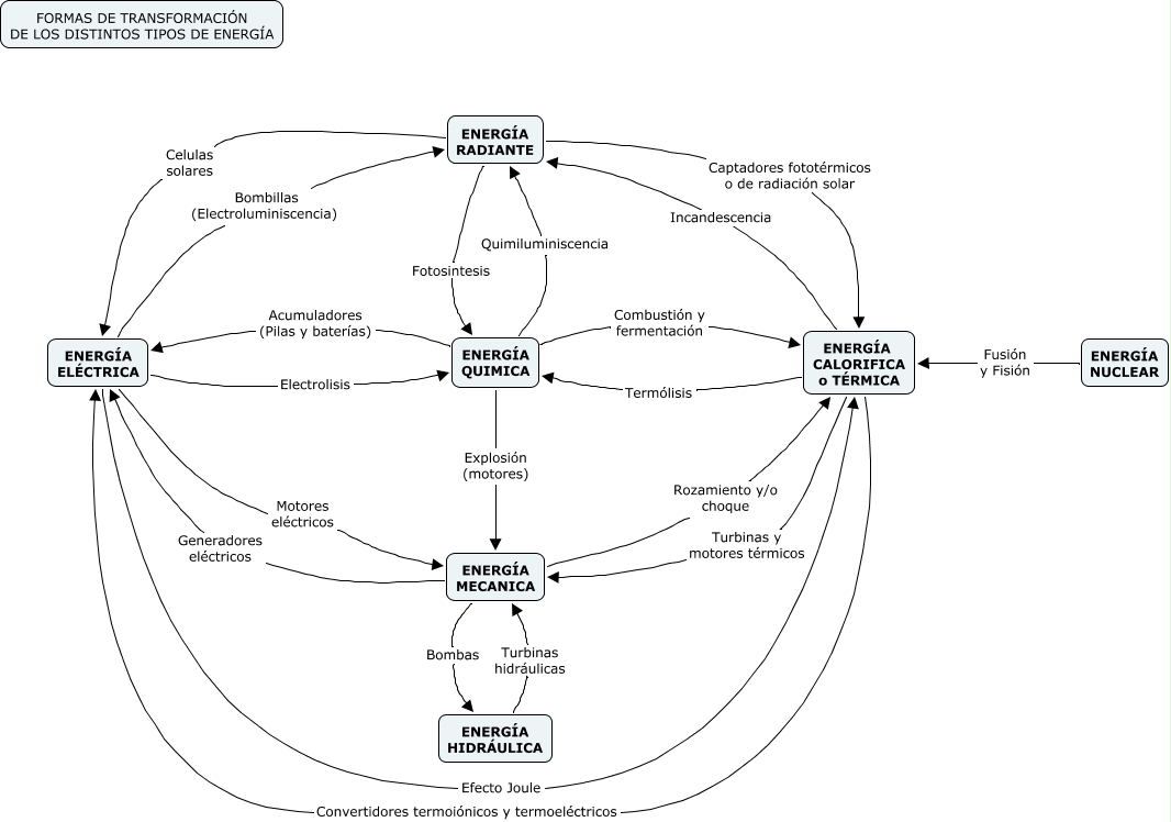 Este Cmap, tiene información relacionada con: Trasnform. energias, ENERGÍA MECANICA Bombas ENERGÍA HIDRÁULICA, ENERGÍA ELÉCTRICA Bombillas (Electroluminiscencia) ENERGÍA RADIANTE, ENERGÍA QUIMICA Quimiluminiscencia ENERGÍA RADIANTE, ENERGÍA RADIANTE Captadores fototérmicos o de radiación solar ENERGÍA CALORIFICA o TÉRMICA, ENERGÍA ELÉCTRICA Efecto Joule ENERGÍA CALORIFICA o TÉRMICA, ENERGÍA QUIMICA Combustión y fermentación ENERGÍA CALORIFICA o TÉRMICA, ENERGÍA HIDRÁULICA Turbinas hidráulicas ENERGÍA MECANICA, ENERGÍA QUIMICA Acumuladores (Pilas y baterías) ENERGÍA ELÉCTRICA, ENERGÍA ELÉCTRICA Motores eléctricos ENERGÍA MECANICA, ENERGÍA CALORIFICA o TÉRMICA Termólisis ENERGÍA QUIMICA, ENERGÍA QUIMICA Explosión (motores) ENERGÍA MECANICA, ENERGÍA CALORIFICA o TÉRMICA Convertidores termoiónicos y termoeléctricos ENERGÍA ELÉCTRICA, ENERGÍA RADIANTE Celulas solares ENERGÍA ELÉCTRICA, ENERGÍA CALORIFICA o TÉRMICA Turbinas y motores térmicos ENERGÍA MECANICA, ENERGÍA MECANICA Generadores eléctricos ENERGÍA ELÉCTRICA, ENERGÍA CALORIFICA o TÉRMICA Incandescencia ENERGÍA RADIANTE, ENERGÍA RADIANTE Fotosintesis ENERGÍA QUIMICA, ENERGÍA ELÉCTRICA Electrolisis ENERGÍA QUIMICA, ENERGÍA NUCLEAR Fusión y Fisión ENERGÍA CALORIFICA o TÉRMICA, ENERGÍA MECANICA Rozamiento y/o choque ENERGÍA CALORIFICA o TÉRMICA