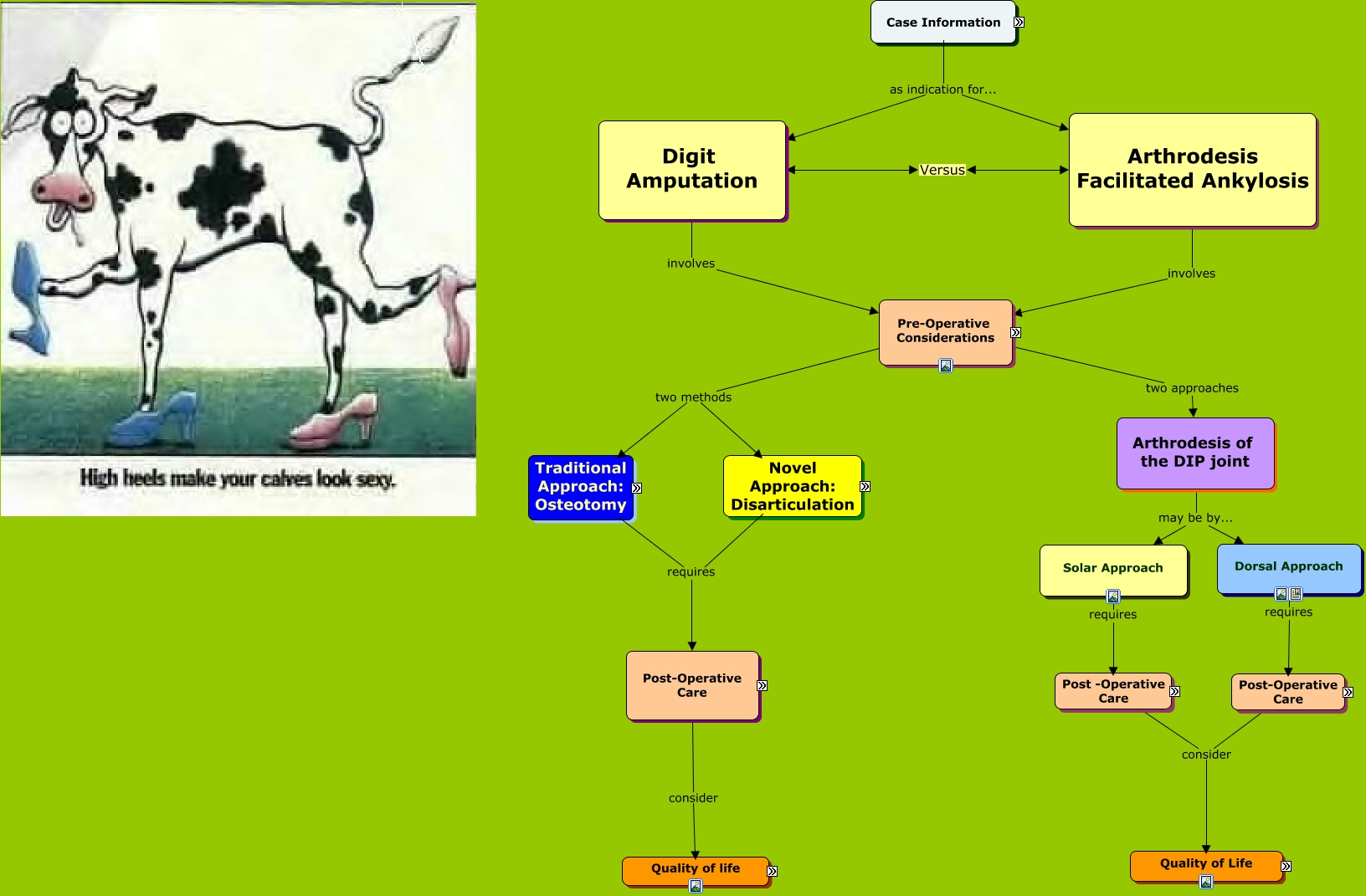 This Concept Map, created with IHMC CmapTools, has information related to: LAS Assignment 5 - Digit Amputation, Animal Considerations include Pre-medication & nerve block, Procedures has the following steps 2. The incision is continued to the bone and joint capsule to sever the collateral ligaments and tendons., Post Operative Care involves TLC, Length of surgery managed by proper preparations & good technique, Post-Operative Care involves systemic Abs for 2-3 weeks, 4. The amputation can be performed in two locations depending on which areas are diseased. 2 Locations Low Amputation: The gigli wire is directed through the middle phalanx, Post -Operative Care consider Quality of Life, Client Considerations inform client of cost of operation, Cons include.... Ascending Tendonitis, Pros include more mechanically stable, Vet Responsibilites prerequisite Knowledge, Procedures Includes 2. Skin and subcutaneous tissues are incised to the bone. The skin is then undermined and an attempt is made to save as much skin as possible., Post-Operative Care involves lavage daily for a week (or until infxn is controlled), Cons include.... Reduction in Milk Production in Diary Cattle 60 days Post-op, Pros include more cosmetic healing, Tools including -Antiseptic solution -Gauze -Rope -Tourniquet -Butterfly catheter -Sharp, Sterile Knife -Scalpel holder & blade -Suture needle -Appropriate suture material -Bandages, Intra-Op Considerations what are the...? Complications, Quality of Life? affected in either Cons, Case Information as indication for... Arthrodesis Facilitated Ankylosis, Vet Responsibilites drugs Drugs