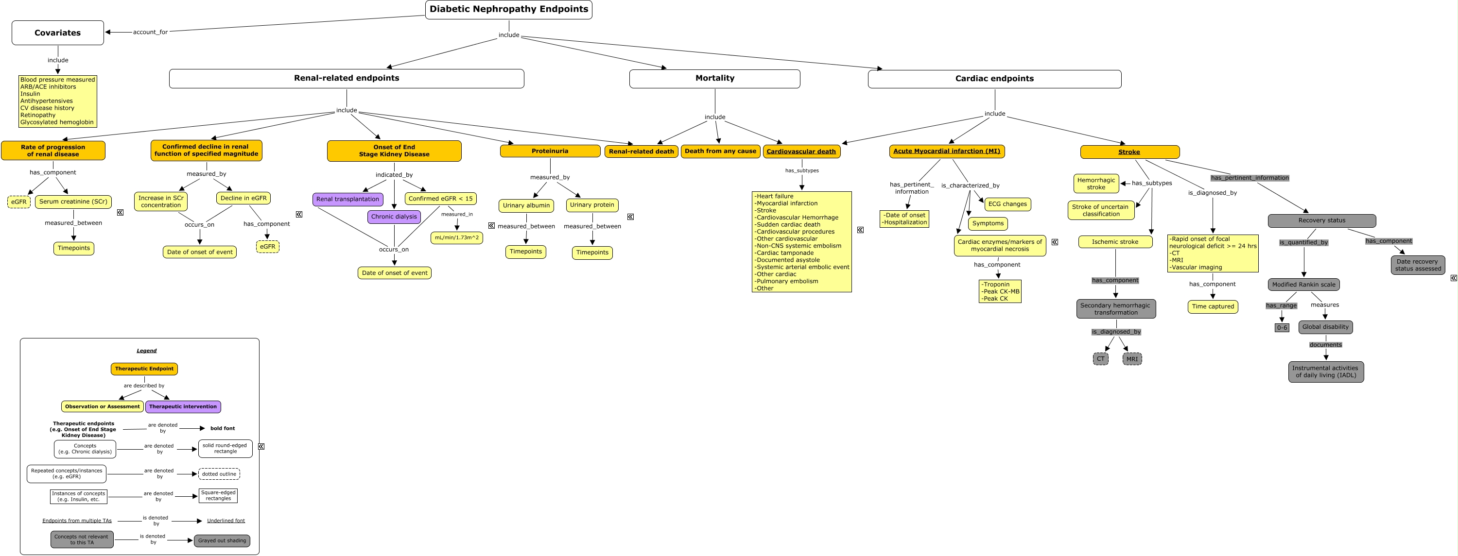 This Concept Map, created with IHMC CmapTools, has information related to: Diabetic_Nephropathy_CMAP_v4, Mortality include Renal-related death, Urinary albumin measured_between Timepoints, Modified Rankin scale has_range 0-6, Renal-related endpoints include Rate of progression of renal disease, Renal-related endpoints include Confirmed decline in renal function of specified magnitude, Recovery status has_component Date recovery status assessed, Mortality include Death from any cause, Increase in SCr concentration occurs_on Date of onset of event, Decline in eGFR occurs_on Date of onset of event, Diabetic Nephropathy Endpoints include Renal-related endpoints, Mortality include Cardiovascular death, Instances of concepts (e.g. Insulin, etc. are denoted by Square-edged rectangles, Diabetic Nephropathy Endpoints include Mortality, Renal-related endpoints include Onset of End Stage Kidney Disease, Confirmed decline in renal function of specified magnitude measured_by Decline in eGFR, Onset of End Stage Kidney Disease indicated_by Renal transplantation, Serum creatinine (SCr) measured_between Timepoints, Onset of End Stage Kidney Disease indicated_by Chronic dialysis, Onset of End Stage Kidney Disease indicated_by Confirmed eGFR < 15, Chronic dialysis occurs_on Date of onset of event