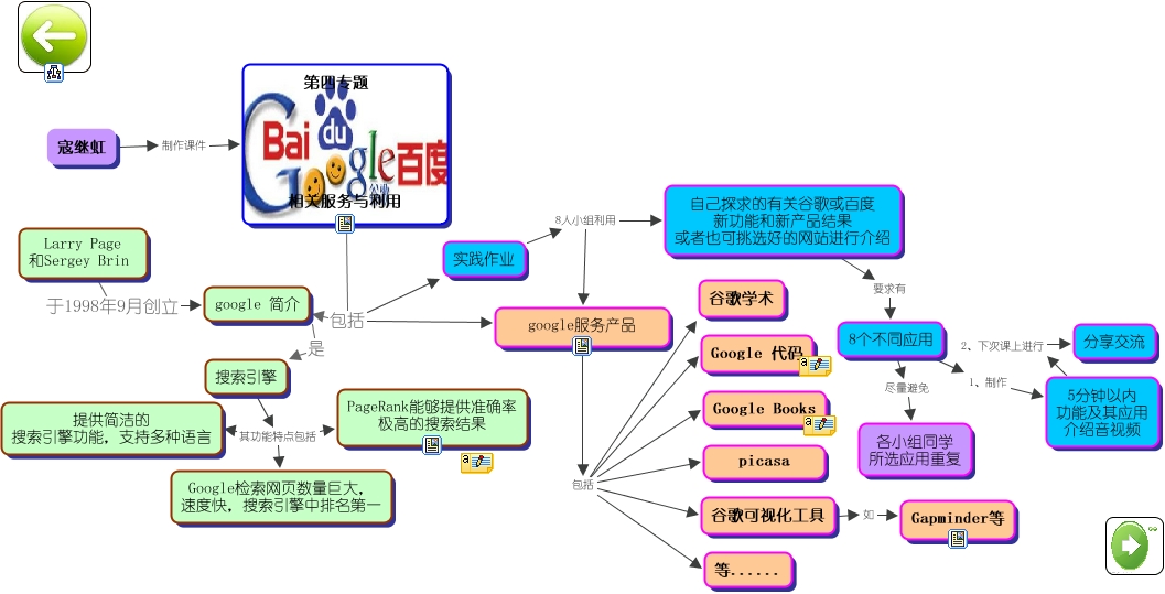 此概念图以 IHMC CmapTools 创建, 内含信息有关于: 第四专题(14年13级) google、百度相关服务及使用, 5分钟以内 功能及其应用 介绍音视频 2、下次课上进行 分享交流, 8个不同应用 1、制作 5分钟以内 功能及其应用 介绍音视频, 搜索引擎 其功能特点包括 PageRank能够提供准确率 极高的搜索结果, 寇继虹 制作课件 第四专题 相关服务与利用, 第四专题 相关服务与利用 包括 google服务产品, google服务产品 包括 Google Books, 实践作业 8人小组利用 自己探求的有关谷歌或百度 新功能和新产品结果 或者也可挑选好的网站进行介绍, 8个不同应用 尽量避免 各小组同学 所选应用重复, google服务产品 包括 Google 代码, google服务产品 包括 谷歌可视化工具, 搜索引擎 其功能特点包括 Google检索网页数量巨大, 速度快,搜索引擎中排名第一, 搜索引擎 其功能特点包括 提供简洁的 搜索引擎功能,支持多种语言, 第四专题 相关服务与利用 包括 实践作业, google 简介 是 搜索引擎, 第四专题 相关服务与利用 包括 google 简介, google服务产品 包括 谷歌学术, 谷歌可视化工具 如 Gapminder等, 实践作业 8人小组利用 google服务产品, Larry Page 和Sergey Brin 于1998年9月创立 google 简介, 自己探求的有关谷歌或百度 新功能和新产品结果 或者也可挑选好的网站进行介绍 要求有 8个不同应用