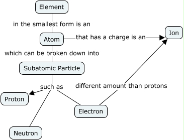 This Concept Map, created with IHMC CmapTools, has information related to: Atoms and Matter, Subatomic Particle such as Proton, Electron different amount than protons Ion, Subatomic Particle such as Neutron, Atom which can be broken down into Subatomic Particle, Element in the smallest form is an Atom, Atom that has a charge is an Ion, Subatomic Particle such as Electron