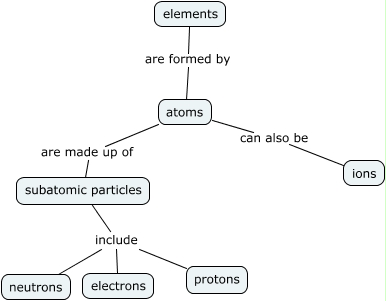 This Concept Map, created with IHMC CmapTools, has information related to: matter, subatomic particles include neutrons, subatomic particles include protons, elements are formed by atoms, subatomic particles include electrons, atoms can also be ions, atoms are made up of subatomic particles