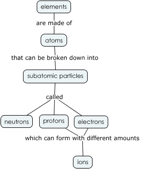 This Concept Map, created with IHMC CmapTools, has information related to: Basic Structure of Matter, subatomic particles called protons, elements are made of atoms, atoms that can be broken down into subatomic particles, protons which can form with different amounts ions, subatomic particles called neutrons, electrons which can form with different amounts ions, subatomic particles called electrons