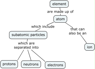 This Concept Map, created with IHMC CmapTools, has information related to: Basic Structure of Matter, subatomic particles which are separated into electrons, subatomic particles which are separated into neutrons, subatomic particles which are separated into protons, element are made up of atom, atom which include subatomic particles, atom that can also be an ion