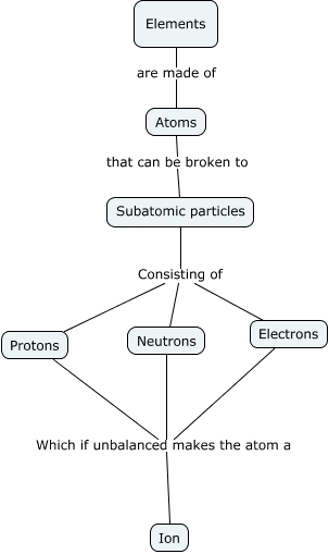 This Concept Map, created with IHMC CmapTools, has information related to: Basic Structure of Matter, Subatomic particles Consisting of Electrons, Electrons Which if unbalanced makes the atom a Ion, Neutrons Which if unbalanced makes the atom a Ion, Protons Which if unbalanced makes the atom a Ion, Elements are made of Atoms, Subatomic particles Consisting of Protons, Atoms that can be broken to Subatomic particles, Subatomic particles Consisting of Neutrons