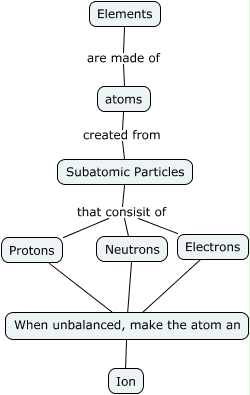 This Concept Map, created with IHMC CmapTools, has information related to: Basic Structure of Matter, Protons When unbalanced, make the atom an, atoms created from Subatomic Particles, Elements are made of atoms, Electrons When unbalanced, make the atom an, Subatomic Particles that consisit of Neutrons, Neutrons When unbalanced, make the atom an, Subatomic Particles that consisit of Protons, When unbalanced, make the atom an Ion, Subatomic Particles that consisit of Electrons