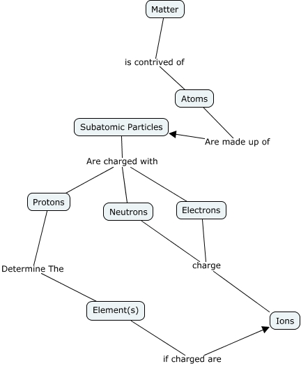 This Concept Map, created with IHMC CmapTools, has information related to: Matter, Neutrons charge Ions, Subatomic Particles Are charged with Electrons, Atoms Are made up of Subatomic Particles, Matter is contrived of Atoms, Protons Determine The Element(s), Element(s) if charged are Ions, Protons Are charged with Electrons, Subatomic Particles Are charged with Neutrons, Protons Are charged with Neutrons, Electrons charge Ions