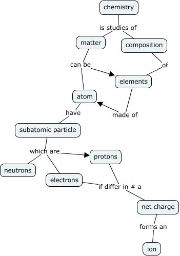 This Concept Map, created with IHMC CmapTools, has information related to: Basic structure of matter, chemistry is studies of matter, chemistry is studies of composition, protons if differ in # a net charge, subatomic particle which are protons, elements made of atom, electrons if differ in # a net charge, atom have subatomic particle, subatomic particle which are neutrons, matter can be atom, composition of elements, matter can be elements, subatomic particle which are electrons, net charge forms an ion
