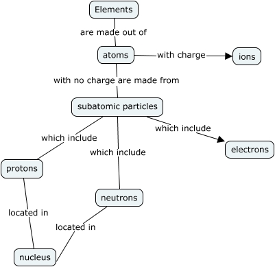 This Concept Map, created with IHMC CmapTools, has information related to: basic structure of matter, subatomic particles which include neutrons, Elements are made out of atoms, atoms with charge ions, protons located in nucleus, subatomic particles which include electrons, atoms with no charge are made from subatomic particles, subatomic particles which include protons, neutrons located in nucleus
